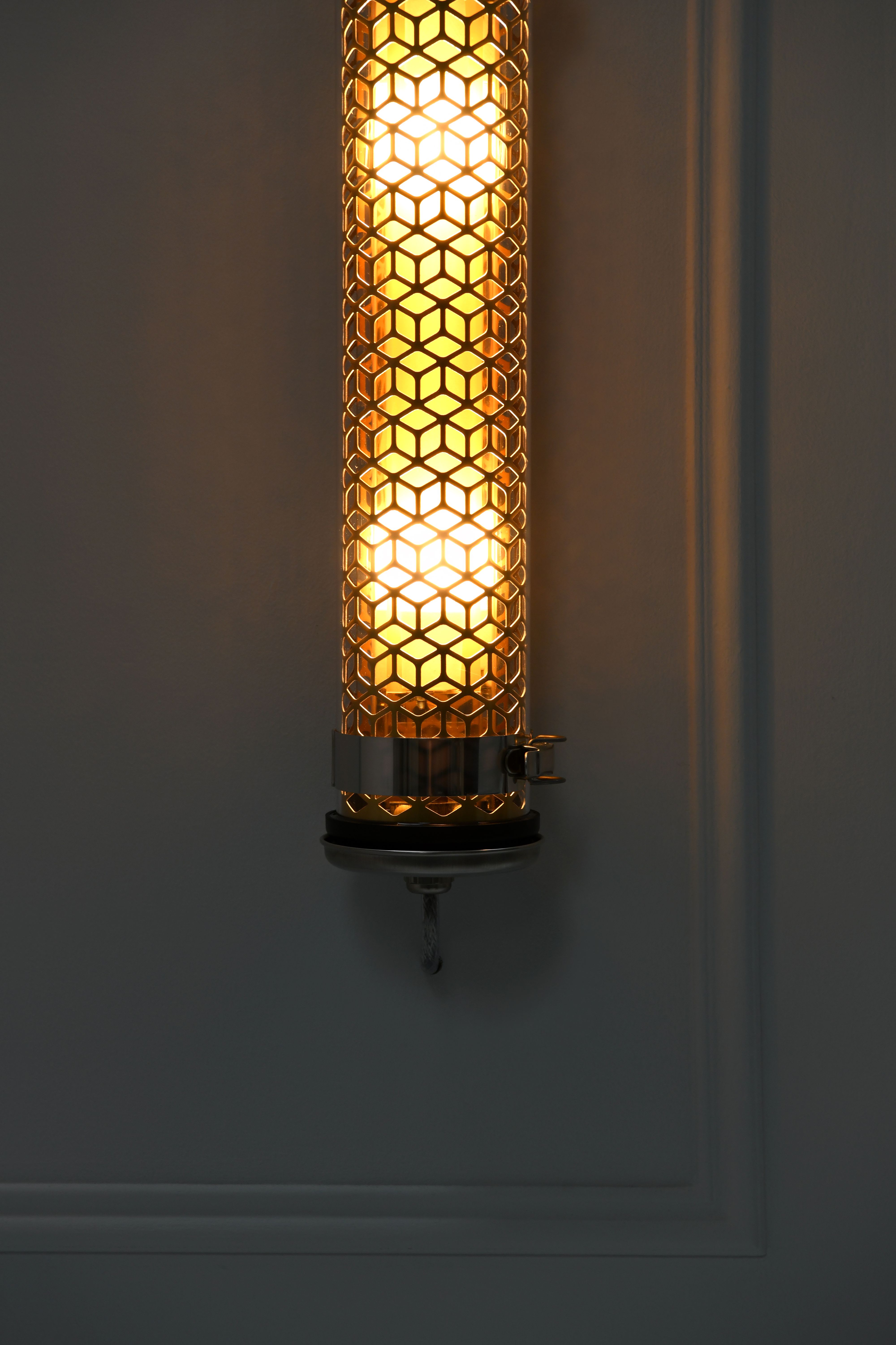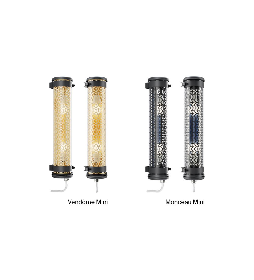 Luminaire tubulaire diamètre 100 à grille multiperforée et ampoules LED, hautement décoratif, idéal en applique murale. Lignes épurées, finitions haut de gamme et qualité industrielle des matériaux, pour offrir une signature unique, durable et résolument contemporaine à vos espaces intérieurs ou extérieurs.Petite sœur de la grande suspension Vendôme, cette applique mettra en valeur votre mur par son éclairage doux et chaleureux. La grille du Vendôme mini, avec ses motifs imbriqués, fait référence aux artères qui rejoignent la célèbre place parisienne, réputée pour ses grandes maisons de haute joaillerie. Cette applique décorative vous permettra de créer deux ambiances selon la finition choisie : la version Brass - mariant le laiton et l’inox - pour créer une ambiance chaleureuse aux reflets dorés, ou la version Coal - laquée noir charbon - pour une ambiance post-industrielle hyper tendance. Avec son réflecteur brossé mis en lumière par deux ampoules LED, le Vendôme mini est bien plus qu’une applique, c’est un véritable petit bijou.Ce luminaire est livré prêt pour l’installation et est équipé de son câble, de sa source et d’une sortie murale. Tous nos luminaires sont fabriqués, assemblés et emballés dans notre usine à Châtillon-sur-Saône dans les Vosges. Design : Normal Studio.