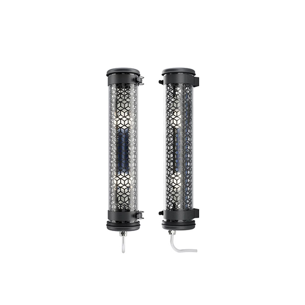 Applique tubulaire Vendôme 100 2L (design : Normal Studio) - Grille à perforation nid d'abeille - Couleur : COAL (RAL 7021) - Grille finition COAL - Vasque : Coextrudé de polycarbonate/PMMA insensible aux UV pour un usage intérieur/extérieur - Flasques & Colliers : Inox 316L laqués COAL (RAL 7021) - Réflecteur en aluminium anodisé : PETROL - Grille en aluminium laqué COAL (RAL 7021) insérée à l'intérieur de la vasque - Toute partie métallique externe en inox 316L et visserie en inox A4 - Platine inox avec 2 douilles porcelaine E14 - Joints : Joints moulés en EPDM - Avec 2 lampes filament LED E14 4W 2700K claires - Flux lumineux: 100 lm - Température de couleur: 2700 K - Gradation par un module CASAMBI intégré - Diamètre : 100 mm - Longueur hors tout: 519 mm - Fourni équipé de 1m de câble 3G1,5 avec tresse en cuivre étamé sous gaine transparente - Fixation par 2 colliers renforcés en inox à grenouillère (à entraxe variable) et permettant une orientation sur 360° - Fourni avec un boitier de sortie murale en inox 316L, usage intérieur (IP 40), à raccorder à la terre - Installation en position verticale, presse-étoupe vers le bas - Garantie 5 ans - Température d’utilisation : -20 °C à +35 °C - Indice de protection : IP66/IP68/IP69K - Résistance aux chocs : IK10 - Classe électrique : Classe I - Alimentation : 220-240V 50/60Hz - Consommation: 8 W - Résistance au fil incandescent : 650°C - Poids: 1,8 kg - Conçu et fabriqué en France