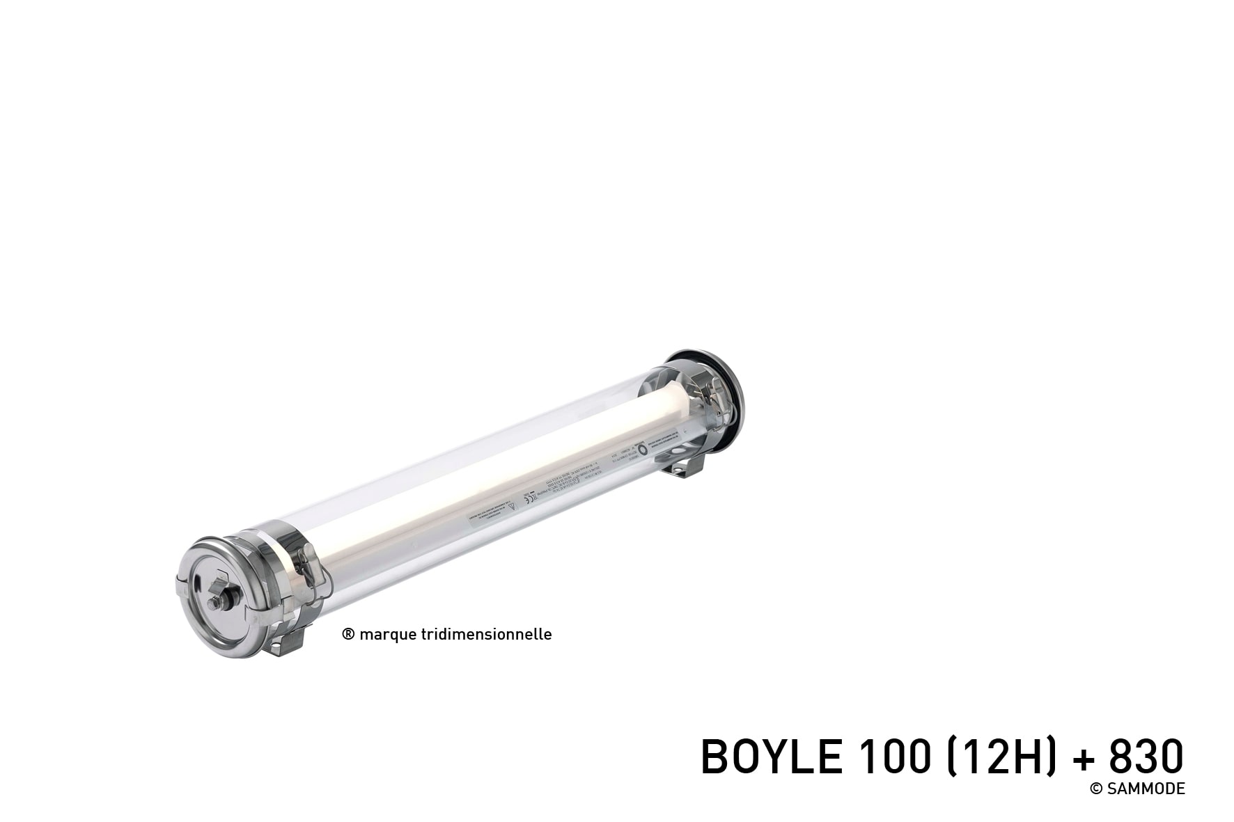 Luminaire tubulaire BOYLE 133 pour ambiances explosibles classées Zone 2 (Gaz) ou Zones 21&22 (Poussières) - Flasques inox en forme de 1/2 tore creux - Diffuseur optique - Vasque Ø133 mm en polycarbonate protégé des UV, des solvants, des hydrocarbures et des agents lessiviels par une coextrusion de méthacrylate - Enveloppe monobloc à haute résistance mécanique et à étanchéité renforcée, silicone-free - Platine d'appareillage en tôle d'acier laquée blanche - Dissipateur thermique en aluminium - Joints moulés en EPDM - Modules LED démontables à haute efficacité (IRC>80, 70 000h L80/B10@Tmax) - Flux lumineux: 7400 lm - Température de couleur : 4000K - Light mixing chamber - Driver LED robuste spécial industrie, non réglable - Compatible sans restriction avec régimes de neutre TN, TT et IT - Diamètre : 133 mm - Longueur hors tout: 1287 mm - Entrée de câble par 2 presse-étoupes ATEX en polyamide, dont un obturé, pour câblage en repiquage (capacité : Ø6,5 à 14 mm). Ampérage Max 10A - Raccordement par bornier débrochable double étage 5x2,5mm², compatible réseau triphasé - Fixation par colliers renforcés en inox à grenouillère à entraxe variable et permettant une orientation sur 360° - Ouverture hors tension en zone explosible - Maintenance par desserrage des 2 vis de fermeture, démontage du flasque mobile et extraction de la platine - Garantie : 8 ans, en usage 24/7 à temp max - Température d'utilisation : -20°C +50°C - Indice de protection : IP66/IP68/IP69K - Résistance aux chocs : IK10 - Classe I - Tension d'alimentation : 220-240V 0/50/60Hz - Consommation: 50 W - Efficacité lumineuse: 148 lm/W - Facteur de puissance > 0,95 - THD: 7 % - Pic de courant d'appel: 5 A - Durée du courant d'appel à 50% du pic: 1000 µs - Résistance au fil incandescent : 650°C - Nombre de drivers sur MCB type B 16A: 32 pcs - Résistance aux vibrations : Conforme aux conditions sévères de l’EN 60598-1 (tests selon CEI 60068-2-6) - Poids: 4,5 kg - Certifié ATEX (Licences INERIS 15ATEX3002X/INERIS 15ATEX0005X) - II 3G Ex ec IIC T4 Gc (Zone 2) - II 2D Ex tb IIIC T70°C Db IP66/IP68 (Zones 21&22) - Certifié IECEx (Licence IECEx INE 15.0014X) - Conçu et fabriqué en France