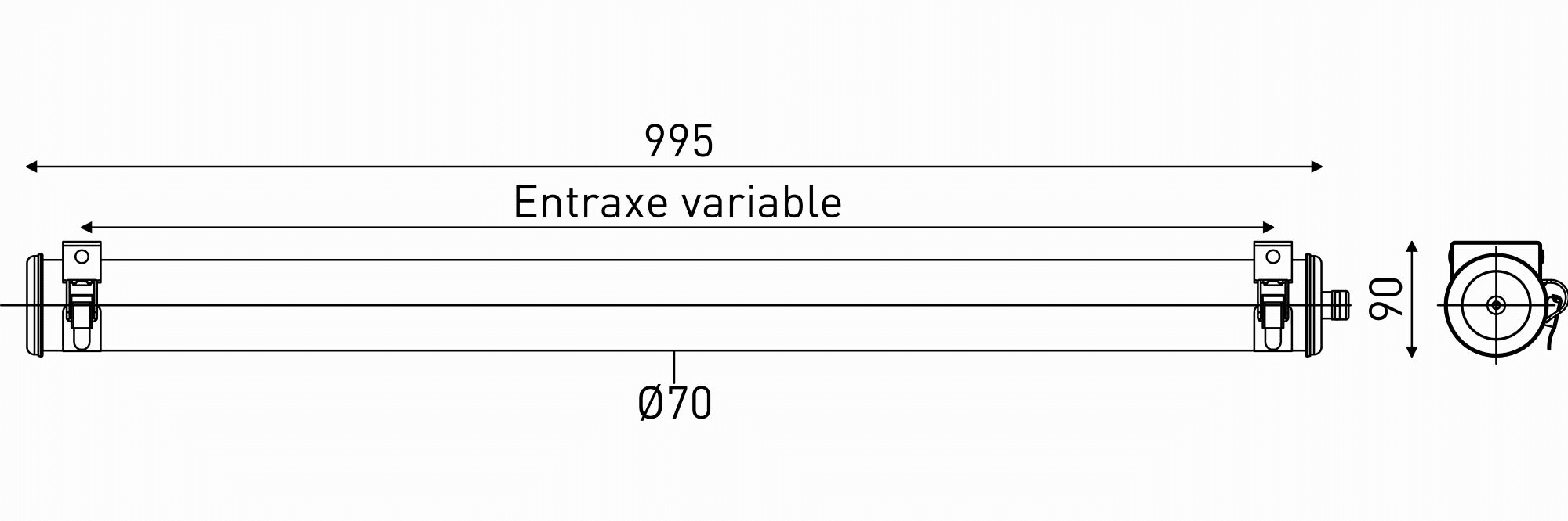 Luminaire tubulaire compact pour espaces réduits FOUCAULT 70 - Vasque : Coextrudé de polycarbonate/PMMA insensible aux UV pour un usage intérieur/extérieur - Flasques inox en forme de 1/2 tore creux - Enveloppe monobloc à étanchéité renforcée par expansion radiale du joint - Platine d'appareillage en tôle d'acier laquée blanche avec système de connexion électrique automatique à la fermeture et indexation en rotation - Dissipateur thermique en aluminium - Joints moulés en EPDM - Modules LED démontables à haute efficacité (IRC>80, 70 000h L80/B10@Tmax) - Flux lumineux: 2400 lm - Température de couleur: 4000 K - Light mixing chamber - Driver LED non réglable - Diamètre : 70 mm - Longueur hors tout: 995 mm - Entrée de câble par 1 presse-étoupe en laiton nickelé (Ø8 à 12 mm) - Raccordement par Bornier débrochable 2x2,5mm² - Fixation par colliers en inox à vis CHC à entraxe variable et permettant une orientation sur 360° - Maintenance sans intervention sur le câble par extraction de la platine par le côté opposé à l'alimentation - Garantie : 8 ans, en usage 24/7 à temp max - Température d’utilisation : -20 °C à +40 °C - Étanchéité : IP66, IP68 et IP69K - Résistance aux chocs : IK10 - Classe II - Tension d'alimentation : 220-240 V 50/60 Hz - Consommation: 20 W - Efficacité lumineuse: 120 lm/W - Facteur de puissance > 0,95 - THD: 15,5 % - Risque photobiologique : Groupe 0 - Pic de courant d'appel: 23,4 A - Durée du courant d'appel à 50% du pic: 121 µs - Résistance au feu : 650 °C - Nombre de drivers sur MCB type B 16A: 33 pcs - Résistance aux vibrations : Conforme aux conditions sévères de l’EN 60598-1 (tests selon CEI 60068-2-6) - Conception mécanique testée selon norme ferroviaire IEC 61373 (essais de vibrations du matériel roulant) - Poids: 2 kg - Conçu et fabriqué en France