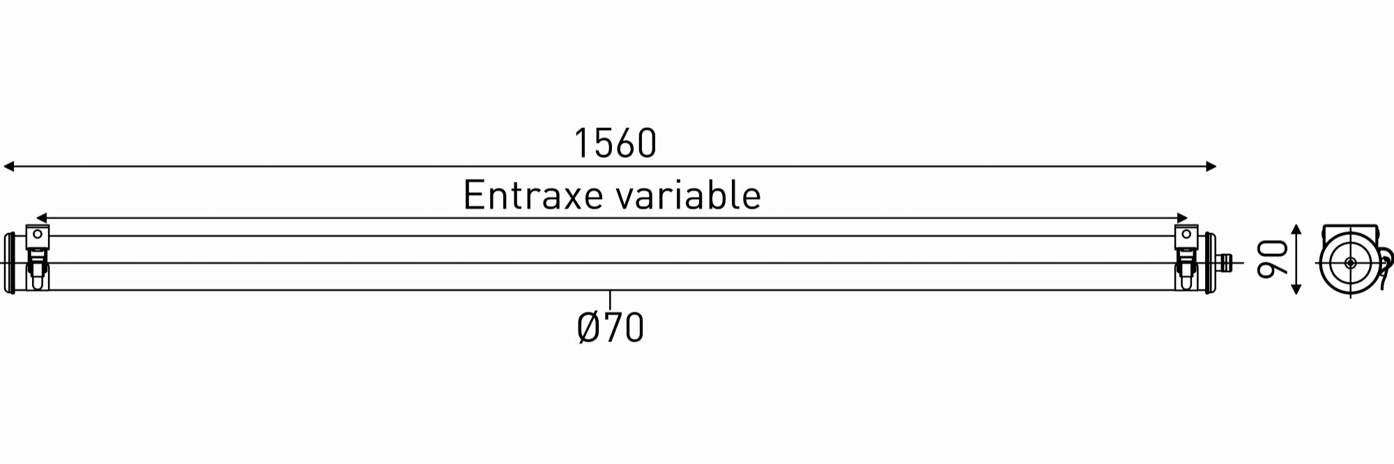 Luminaire tubulaire compact pour espaces réduits FOUCAULT 70 - Vasque : Coextrudé de polycarbonate/PMMA insensible aux UV pour un usage intérieur/extérieur - Flasques inox en forme de 1/2 tore creux - Enveloppe monobloc à étanchéité renforcée par expansion radiale du joint - Platine d'appareillage en tôle d'acier laquée blanche avec système de connexion électrique automatique à la fermeture et indexation en rotation - Dissipateur thermique en aluminium - Joints moulés en EPDM - Modules LED démontables à haute efficacité (IRC>80, 70 000h L80/B10@Tmax) - Flux lumineux: 4000 lm - Température de couleur: 4000 K - Light mixing chamber - Driver LED non réglable - Diamètre : 70 mm - Longueur hors tout: 1560 mm - Raccordement par prise débrochable 3x1,5mm² - Fixation par colliers en inox à vis CHC à entraxe variable et permettant une orientation sur 360° - Maintenance sans intervention sur le câble par extraction de la platine par le côté opposé à l'alimentation - Garantie : 8 ans, en usage 24/7 à temp max - Température d’utilisation : -20 °C à +40 °C - Étanchéité : IP66, IP68 et IP69K - Résistance aux chocs : IK10 - Classe I - Tension d'alimentation : 220-240 V 50/60 Hz - Consommation: 31 W - Efficacité lumineuse: 129 lm/W - Facteur de puissance > 0,95 - THD: 13,9 % - Risque photobiologique : Groupe 0 - Pic de courant d'appel: 23,4 A - Durée du courant d'appel à 50% du pic: 121 µs - Résistance au feu : 650 °C - Nombre de drivers sur MCB type B 16A: 33 pcs - Résistance aux vibrations : Conforme aux conditions sévères de l’EN 60598-1 (tests selon CEI 60068-2-6) - Conception mécanique testée selon norme ferroviaire IEC 61373 (essais de vibrations du matériel roulant) - Poids: 2,9 kg - Conçu et fabriqué en France