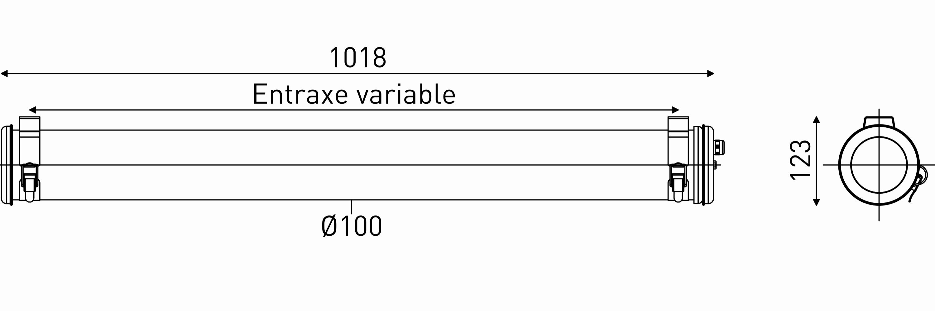 Luminaire tubulaire JAMIN 100 pour ambiances explosibles classées Zone 2 (Gaz) ou Zones 21&22 (Poussières) - Flasques inox en forme de 1/2 tore creux - Diffuseur optique - Vasque Ø100 mm en polycarbonate protégé des UV, des solvants, des hydrocarbures et des agents lessiviels par une coextrusion de méthacrylate - Toute partie métallique externe en inox 316L et visserie en inox A4 - Enveloppe monobloc à étanchéité renforcée, silicone-free - Platine d'appareillage en tôle d'acier laquée blanche guidée et verrouillable - Dissipateur thermique en aluminium - Joints moulés en EPDM - Modules LED démontables à haute efficacité (IRC>80, 70 000h L80/B10@Tmax) - Flux lumineux: 2775 lm - Température de couleur : 4000K - Light mixing chamber - Driver LED non réglable - Diamètre : 100 mm - Longueur hors tout: 1018 mm - Entrée de câble par 1 presse-étoupe ATEX en polyamide (capacité : Ø6,5 à 14 mm) - Raccordement par Bornier débrochable 3x2,5mm² - Fixation par colliers renforcés en inox à vis CHC à entraxe variable et permettant une orientation sur 360° - Ouverture hors tension en zone explosible - Maintenance par démontage du flasque mobile et coulissement de la platine guidée - Garantie : 8 ans, en usage 24/7 à temp max - Température d’utilisation : -20 °C à +35 °C - Indice de protection : IP66/IP68/IP69K - Résistance aux chocs : IK10 - Classe I - Tension d'alimentation : 220-240V 0/50/60Hz - Consommation: 21 W - Efficacité lumineuse: 132 lm/W - Facteur de puissance > 0,95 - THD: 15,2 % - Pic de courant d'appel: 121 A - Durée du courant d'appel à 50% du pic: 23,4 µs - Résistance au fil incandescent : 650°C - Nombre de drivers sur MCB type B 16A: 33 pcs - Résistance aux vibrations : Conforme aux conditions sévères de l’EN 60598-1 (tests selon CEI 60068-2-6) - Poids: 2,8 kg - Certifié ATEX (Licences INERIS 15ATEX3002X/INERIS 15ATEX0005X) - II 3G Ex ec IIC T4 Gc (Zone 2) - II 2D Ex tb IIIC T70°C Db IP66/IP68 (Zones 21&22) - Certifié IECEx (Licence IECEx INE 15.0014X) - Conçu et fabriqué en France
