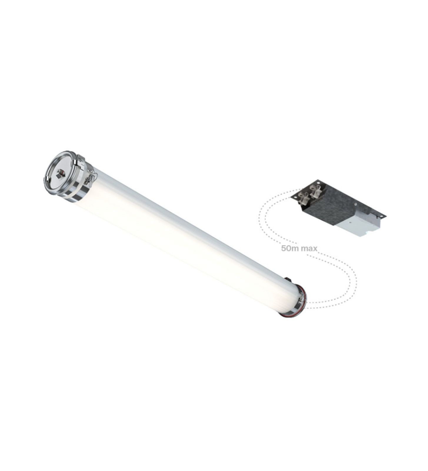 Luminaire tubulaire LED à platine d’appareillage déportée dédié à l'éclairage de zones hautes températures jusqu'à 85°C : idéal process industriels lourds (sidérurgie, chimie, papeteries, verreries) et process agroalimentaires (hottes de cuisson, cellules de fumage, malteries...).Electronique très haute fiabilité montée sur platine d’appareillage à déporter jusqu’à 50m max et 60°C max, livrée avec chaque luminaire. Enveloppe tubulaire à l’étanchéité ultime et durable IP68-IP69K, de conception monobloc insensible aux chocs thermiques, aux impacts et aux vibrations (système SCREW). Parties métalliques externes en inox et vasque polycarbonate à haute résistance mécanique IK10. Modules LED sur base aluminium spécifiquement conçus pour une gestion thermique optimale et une haute durée de vie, même en usage permanent à température maximale.Très fortes économies d’énergie et de maintenance. GARANTIE 5 ANS, en usage intensif dans les pires conditions. Conçu et fabriqué en FRANCE, pensé pour durer, évolutif et entièrement réparable, c'est le tubulaire de référence pour l'éclairage des zones de process à très hautes températures.