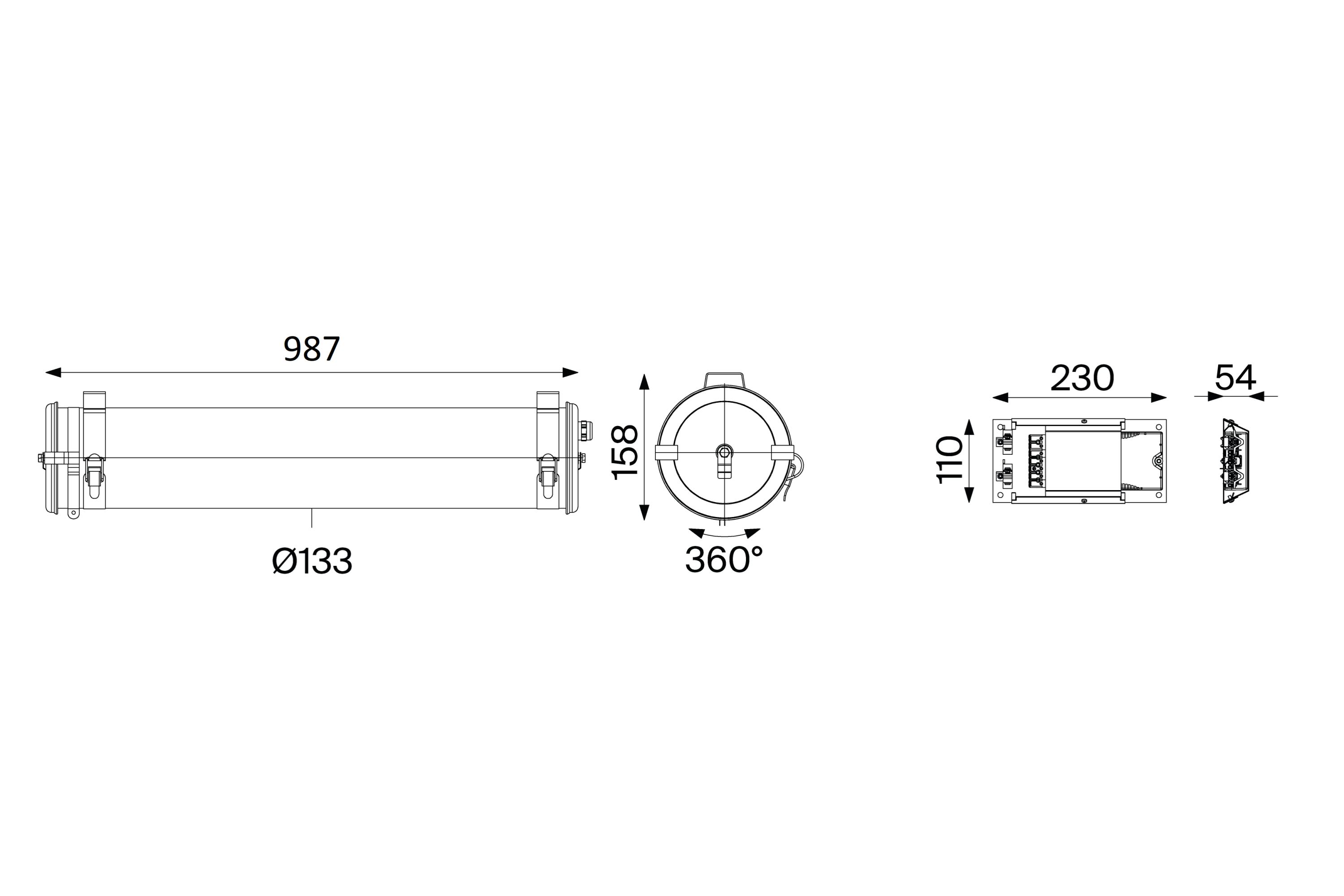 Luminaire tubulaire pour éclairage à haute température JOULE 133 - Livré avec driver sur platine déportée, dédié à l'alimentation en courant constant d'un seul luminaire sans repiquage possible - Platine à installer à 50m max du luminaire et à Ta max 60°C, en acier galvanisé avec capot de protection, IP20, dimensions 230x110x54 mm - Vasque satinée spéciale LED - Il est possible qu’un jaunissement survienne pendant la durée de vie de ce produit, conçu pour des conditions extrêmes. Cela n’empêche pas un fonctionnement normal et ne nécessite pas un remplacement. - Flasques inox en forme de 1/2 tore creux - Vasque Ø133 en polycarbonate - Toute partie métallique externe en inox 316L et visserie en inox A4 - Enveloppe monobloc à haute résistance mécanique et à étanchéité renforcée - Platine d'appareillage en tôle d'acier avec laquage jaune à très haute tenue thermique - Joints moulés haute température en silicone - Modules LED sur base aluminium, spécifiques haute température démontables à haute efficacité, à dissipation thermique renforcée (IRC>80, 50 000h L80/B50@Tmax) - Flux lumineux: 2775 lm - Température de couleur : 4000K - Driver LED non réglable spécial haute température - Compatible sans restriction avec régimes de neutre TN, TT et IT - Longueur hors tout: 987 mm - Entrée de câble par 1 prise débrochable 3x1,5mm² à verrouillage par bague vissée (capacité : Ø8 à 11 mm) - Raccordement par prise débrochable 3x1,5mm² - Câble blindé fortement recommandé pour éviter les perturbations électro-magnétiques sur la ligne - Fixation par colliers renforcés en inox à grenouillère à entraxe variable et permettant une orientation sur 360° - Maintenance par desserrage des 2 vis de fermeture, démontage du flasque mobile et extraction de la platine - Garantie : 5 ans, en usage 24/7 à temp max - Température d'utilisation : -20°C à +85°C - Indice de protection : IP66/IP68/IP69K - Résistance aux chocs : IK10 - Classe I - Tension d'alimentation : 220-240V 0/50/60Hz - Consommation: 23 W - Efficacité lumineuse: 120,5 lm/W - Résistance à la surtension: 320 V AC, 48 h (Supporte les pics de tension < 4 kV) - Facteur de puissance > 0,8 - THD: 20 % - Risque photobiologique : Groupe 0 - Pic de courant d'appel: 41,6 A - Durée du courant d'appel à 50% du pic: 238 µs - Résistance au fil incandescent : 960°C - Nombre de drivers sur MCB type B 16A: 10 pcs - Résistance aux vibrations : Conforme aux conditions sévères de l’EN 60598-1 (tests selon CEI 60068-2-6) - Poids: 3,8 kg - Conçu et fabriqué en France