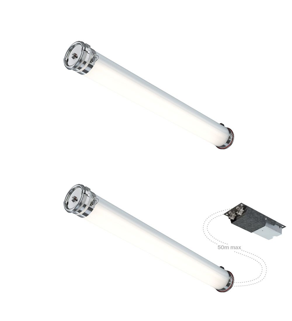 Luminaire tubulaire LED à platine d’appareillage déportée dédié à l'éclairage de zones hautes températures jusqu'à 85°C : idéal process industriels lourds (sidérurgie, chimie, papeteries, verreries) et process agroalimentaires (hottes de cuisson, cellules de fumage, malteries...).Electronique très haute fiabilité montée sur platine d’appareillage à déporter jusqu’à 50m max et 60°C max, livrée avec chaque luminaire. Enveloppe tubulaire à l’étanchéité ultime et durable IP68-IP69K, de conception monobloc insensible aux chocs thermiques, aux impacts et aux vibrations (système SCREW). Parties métalliques externes en inox et vasque polycarbonate à haute résistance mécanique IK10. Modules LED sur base aluminium spécifiquement conçus pour une gestion thermique optimale et une haute durée de vie, même en usage permanent à température maximale.Très fortes économies d’énergie et de maintenance. GARANTIE 5 ANS, en usage intensif dans les pires conditions. Conçu et fabriqué en FRANCE, pensé pour durer, évolutif et entièrement réparable, c'est le tubulaire de référence pour l'éclairage des zones de process à très hautes températures.