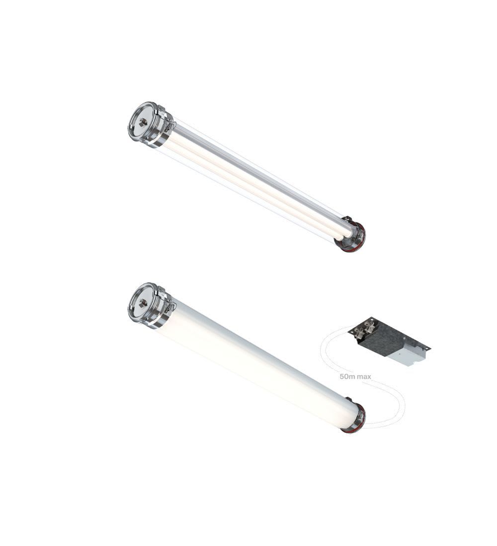 Luminaire tubulaire LED à vasque en verre haute résistance dédié à l'éclairage des environnements industriels les plus extrêmes. Conçu spécifiquement pour un usage permanent à hautes températures jusqu'à 70°C et pour supporter l'accumulation des pires contraintes : vibrations, corrosion, abrasion, réseaux électriques à risque. Etanchéité ultime et durable IP68-IP69K. Matériaux à hautes résistances chimiques et mécaniques IK07. Electronique intégrée, très haute fiabilité et très longue durée de vie.Enveloppe monobloc insensible aux vibrations intenses (système SCREW) et aux grandes variations thermiques. Parties métalliques externes en inox et vasque en verre borosilicaté offrant une résistance inégalable aux températures extrêmes et aux atmosphères acides, corrosives et abrasives. Driver longue durée conçu pour supporter les pires sollicitations thermiques, mécaniques et électriques. Modules hautes températures et gestion thermique spécifique préservant la durée de vie des LED à des températures élevées.Existe avec connecteur débrochable haute résistance pour une installation rapide. Très fortes économies d’énergie et de maintenance. Garantie 5 ans, en usage intensif dans les pires conditions. Conçu et fabriqué en France, pensé pour durer, évolutif et entièrement démontable et réparable, c'est le tubulaire de référence pour l'éclairage des zones de process hautes température jusqu'à 70°C en ambiance particulièrement corrosive.