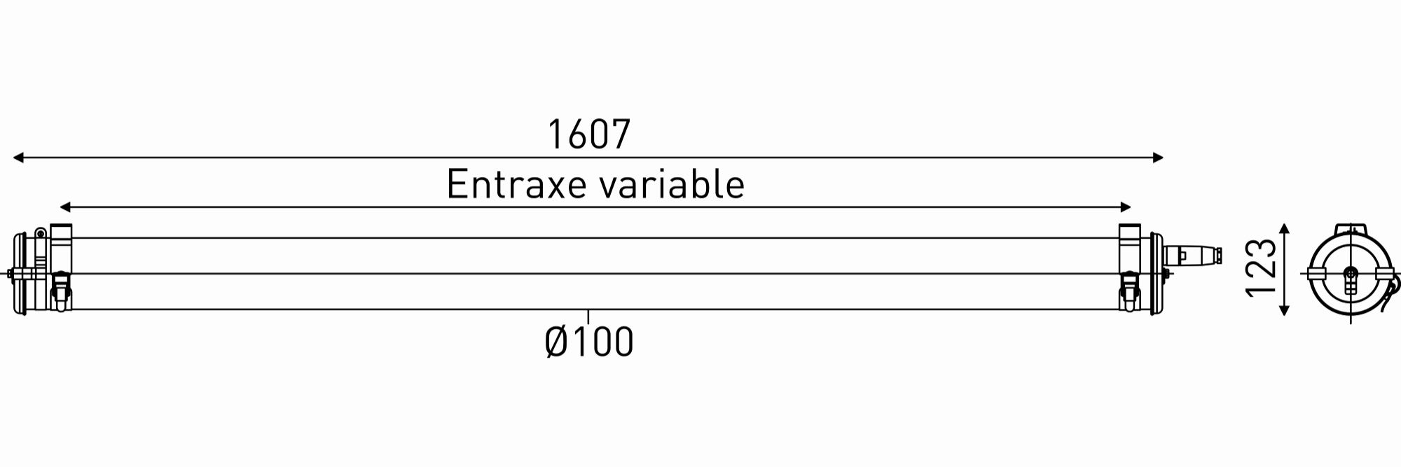Luminaire tubulaire NAPIER 100 - Flasques inox en forme de 1/2 tore creux - Diffuseur optique - Vasque Ø100 mm en verre borosilicaté - Enveloppe monobloc à haute résistance mécanique et à étanchéité renforcée - Platine d'appareillage en tôle d'acier laquée blanche - Dissipateur thermique en aluminium - Joints moulés en EPDM - Modules LED démontables à haute efficacité (IRC>80, 70 000h L80/B10@Tmax) - Flux lumineux: 4625 lm - Température de couleur : 3000K - Light mixing chamber - Driver LED robuste spécial industrie, non réglable - Compatible sans restriction avec régimes de neutre TN, TT et IT - Diamètre : 100 mm - Longueur hors tout: 1607 mm - Entrée de câble par 1 prise débrochable 3x1,5mm² à verrouillage par bague vissée (capacité : Ø8 à 11 mm) - Raccordement par prise débrochable 3x1,5mm² - Fixation par colliers renforcés en inox à grenouillère à entraxe variable et permettant une orientation sur 360° - Maintenance par desserrage des 2 vis de fermeture, démontage du flasque mobile et extraction de la platine - Garantie : 8 ans, en usage 24/7 à temp max - Température d'utilisation : -20°C +50°C - Indice de protection : IP66/IP68/IP69K - Résistance aux chocs : IK07 - Classe I - Tension d'alimentation : 220-240V 0/50/60Hz - Consommation: 35 W - Efficacité lumineuse: 132 lm/W - Résistance à la surtension: 320 V AC, 48 h (Supporte les pics de tension < 4 kV) - Facteur de puissance > 0,9 - THD: 8 % - Risque photobiologique : Groupe 0 - Pic de courant d'appel: 5 A - Durée du courant d'appel à 50% du pic: 1000 µs - Nombre de drivers sur MCB type B 16A: 32 pcs - Résistance au fil incandescent : Ininflammable - Résistance aux vibrations : Conforme aux conditions sévères de l’EN 60598-1 (tests selon CEI 60068-2-6) - Conception mécanique testée selon norme ferroviaire IEC 61373 (essais de vibrations du matériel roulant) - Poids: 6,5 kg - Conçu et fabriqué en France