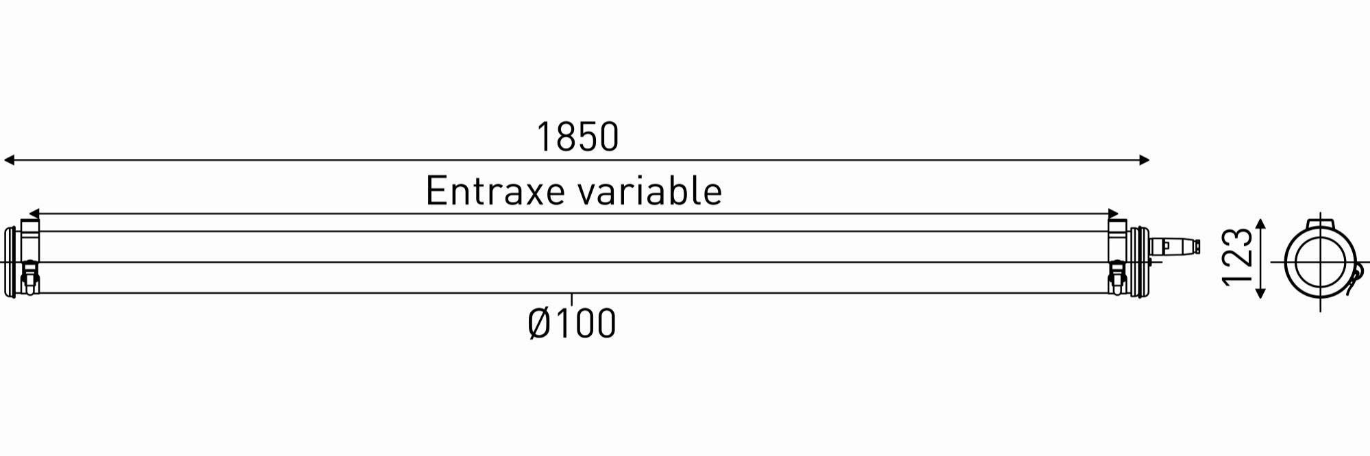 Luminaire tubulaire PASCAL 100 - Vasque satinée - Flasques inox en forme de 1/2 tore creux - Vasque Ø100 mm en polycarbonate protégé des UV, des solvants, des hydrocarbures et des agents lessiviels par une coextrusion de méthacrylate - Enveloppe monobloc à étanchéité renforcée - Platine d'appareillage en tôle d'acier laquée blanche guidée et verrouillable - Joints moulés en EPDM - Modules LED démontables à haute efficacité (IRC>80, 70 000h L80/B10@Tmax) - Flux lumineux: 5550 lm - Température de couleur : 4000K - UGR ? 25 - Driver LED réglable DALI 2 - Diamètre : 100 mm - Longueur hors tout: 1850 mm - Entrée de câble par 1 prise débrochable 5x1,5mm² à verrouillage par bague vissée (capacité : Ø8 à 10 mm) - Raccordement par prise débrochable 5x1,5mm² - Fixation par colliers renforcés en inox à grenouillère à entraxe variable et permettant une orientation sur 360° - Maintenance par démontage du flasque mobile et coulissement de la platine guidée - Garantie : 8 ans, en usage 24/7 à temp max - Température d'utilisation : -20°C +35°C - Indice de protection : IP66/IP68/IP69K - Résistance aux chocs : IK10 - Classe I - Tension d'alimentation : 220-240V 0/50/60Hz - Consommation: 44 W - Efficacité lumineuse: 126 lm/W - Facteur de puissance > 0,95 - THD: 9,5 % - Risque photobiologique : Groupe 0 - Pic de courant d'appel: 25 A - Durée du courant d'appel à 50% du pic: 280 µs - Nombre de drivers sur MCB type B 16A: 24 pcs - Résistance au fil incandescent : 650°C - Poids: 4 kg - Conçu et fabriqué en France
