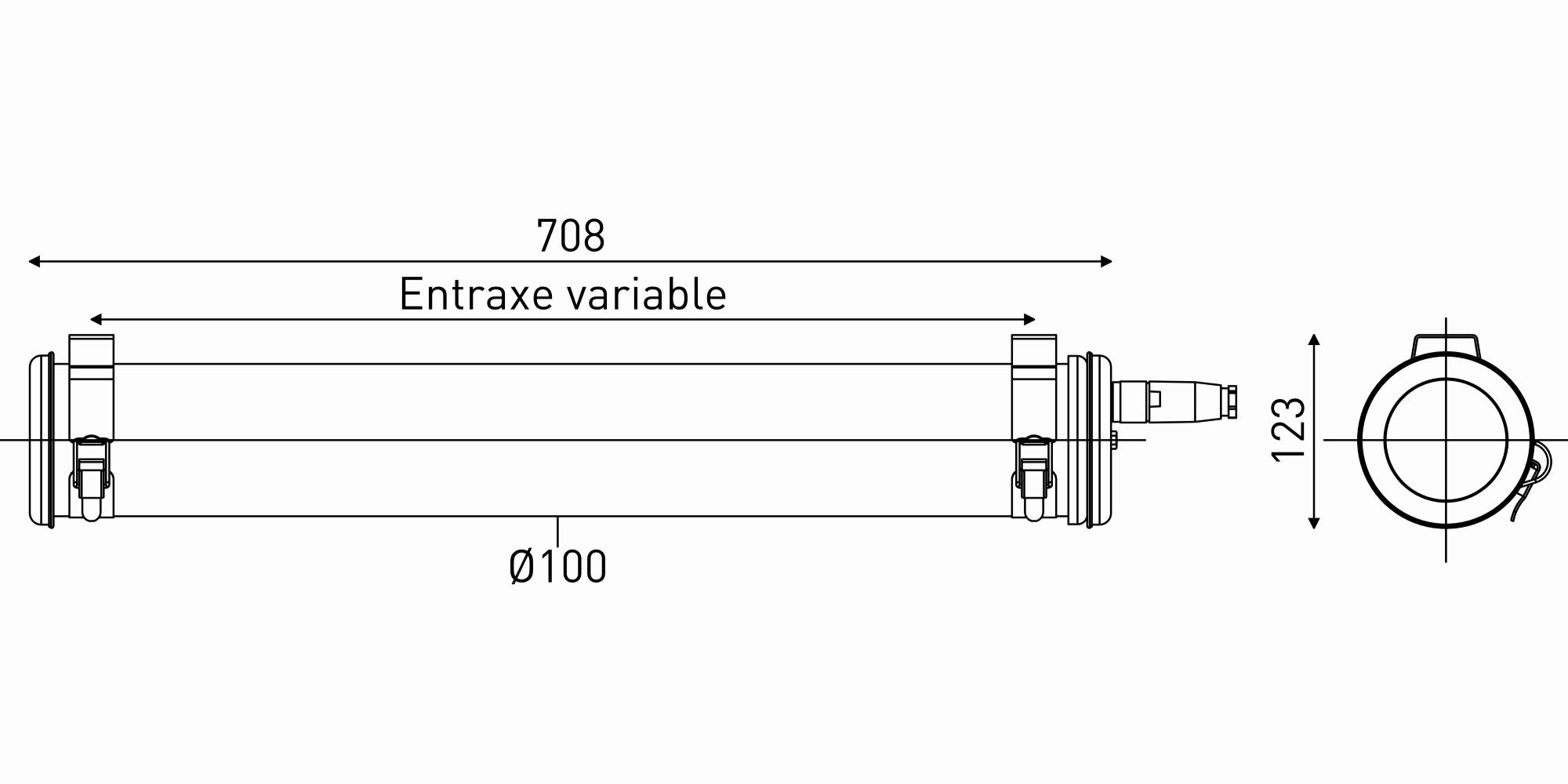 Luminaire tubulaire PASCAL 100 - Vasque satinée - Flasques inox en forme de 1/2 tore creux - Vasque Ø100 mm en polycarbonate protégé des UV, des solvants, des hydrocarbures et des agents lessiviels par une coextrusion de méthacrylate - Toute partie métallique externe en inox 316L et visserie en inox A4 - Enveloppe monobloc à étanchéité renforcée - Platine d'appareillage en tôle d'acier laquée blanche guidée et verrouillable - Joints moulés en EPDM - Modules LED démontables à haute efficacité (IRC>80, 70 000h L80/B10@Tmax) - Flux lumineux: 1850 lm - Température de couleur : 3000K - UGR ? 25 - Driver LED non réglable - Diamètre : 100 mm - Longueur hors tout: 708 mm - Entrée de câble par 2 presse-étoupes en polyamide, dont 1 obturé, pour câblage en repiquage (Ø7 à 12 mm). Ampérage Max 10A - Raccordement par bornier débrochable double étage 5x2,5mm², compatible réseau triphasé - Fixation par colliers renforcés en inox à vis CHC à entraxe variable et permettant une orientation sur 360° - Maintenance par démontage du flasque mobile et coulissement de la platine guidée - Garantie : 8 ans, en usage 24/7 à temp max - Température d'utilisation : -20°C +35°C - Indice de protection : IP66/IP68/IP69K - Résistance aux chocs : IK10 - Classe I - Tension d'alimentation : 220-240V 0/50/60Hz - Consommation: 16 W - Efficacité lumineuse: 115 lm/W - Facteur de puissance > 0,98 - THD: 7,5 % - Risque photobiologique : Groupe 0 - Pic de courant d'appel: 20,4 A - Durée du courant d'appel à 50% du pic: 195 µs - Nombre de drivers sur MCB type B 16A: 24 pcs - Résistance au fil incandescent : 650°C - Poids: 2 kg - Conçu et fabriqué en France