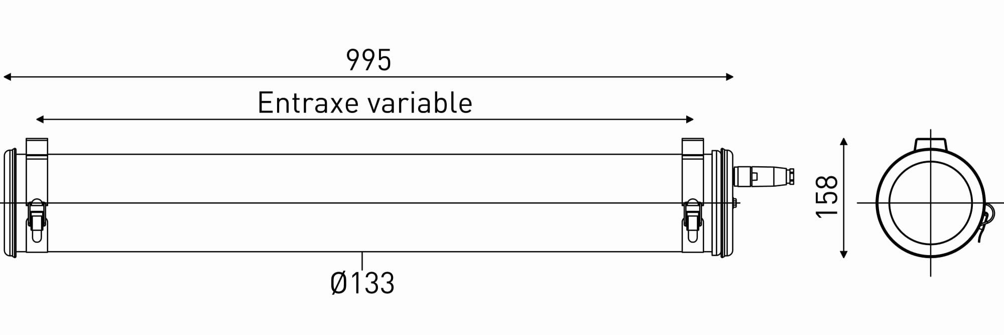 Luminaire tubulaire PASCAL 133 - Vasque satinée - Flasques inox en forme de 1/2 tore creux - Vasque Ø133 mm en polycarbonate protégé des UV, des solvants, des hydrocarbures et des agents lessiviels par une coextrusion de méthacrylate - Enveloppe monobloc à étanchéité renforcée - Platine d'appareillage en tôle d'acier laquée blanche guidée et verrouillable - Joints moulés en EPDM - Modules LED démontables à haute efficacité (IRC>80, 70 000h L80/B10@Tmax) - Flux lumineux: 5550 lm - Température de couleur : 4000K - UGR ? 25 - Driver LED non réglable - Diamètre : 133 mm - Longueur hors tout: 995 mm - Entrée de câble par 1 presse-étoupe en laiton nickelé (capacité : Ø5 à 14 mm) - Raccordement par Bornier débrochable 3x2,5mm² - Fixation par colliers renforcés en inox à grenouillère à entraxe variable et permettant une orientation sur 360° - Maintenance par démontage du flasque mobile et coulissement de la platine guidée - Garantie : 8 ans, en usage 24/7 à temp max - Température d'utilisation : -20°C +35°C - Indice de protection : IP66/IP68/IP69K - Résistance aux chocs : IK10 - Classe I - Tension d'alimentation : 220-240V 0/50/60Hz - Consommation: 46 W - Efficacité lumineuse: 120,5 lm/W - Facteur de puissance > 0,95 - THD: 12,5 % - Risque photobiologique : Groupe 0 - Pic de courant d'appel: 20 A - Durée du courant d'appel à 50% du pic: 288 µs - Nombre de drivers sur MCB type B 16A: 22 pcs - Résistance au fil incandescent : 650°C - Poids: 3,2 kg - Conçu et fabriqué en France