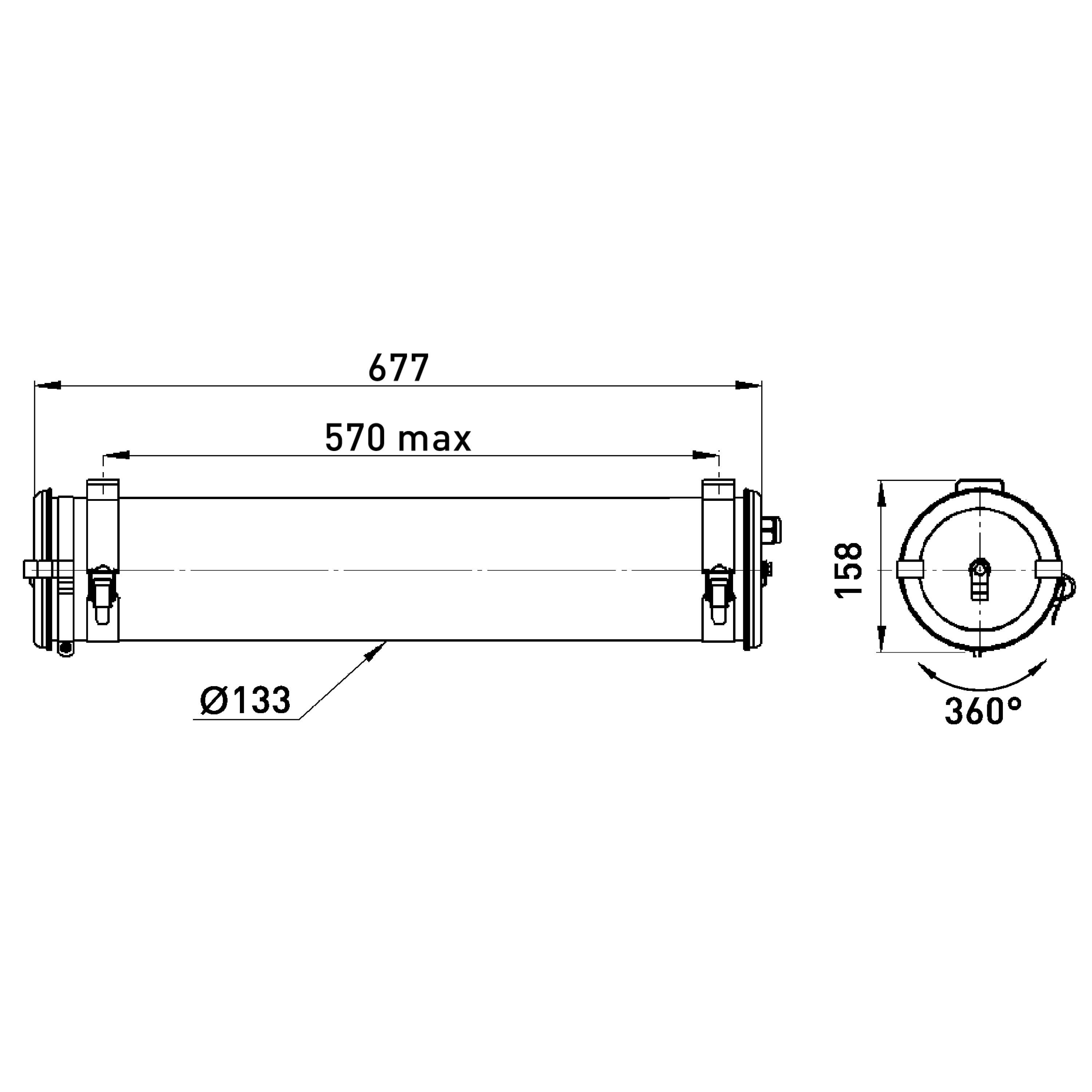 Luminaire tubulaire pour éclairage à haute température PAULI 133 HT200 - Flasques inox en forme de 1/2 tore creux - Vasque Ø135 mm en verre borosilicaté - Toute partie métallique externe en inox 316L et visserie en inox A4 - Platine en inox - Joints moulés haute température en silicone - Câblage interne haute température à isolation silicone tressée fibre de verre - Douille E27 - 2x - 60W - Flux lumineux: 780 lm - Sans lampe - Diamètre : 133 mm - Longueur hors tout: 677 mm - Entrée de câble par 2 presse-étoupes en laiton nickelé, dont 1 obturé, pour câblage en repiquage (capacité : Ø5 à 8 mm). Ampérage Max 10A - Raccordement par Bornier 3x2,5mm² - Fixation par colliers renforcés en inox à vis CHC à entraxe variable et permettant une orientation sur 360° - Maintenance par desserrage des 2 vis de fermeture, démontage du flasque mobile et extraction de la platine - Garantie 5 ans - Température d'utilisation : +200°C max - Indice de protection : IP66/IP68/IP69K - Résistance aux chocs : IK07 - Classe I - Consommation: 120 W - Résistance au fil incandescent : Ininflammable - Résistance aux vibrations : Conforme aux conditions sévères de l’EN 60598-1 (tests selon CEI 60068-2-6) - Poids: 4,5 kg - Conçu et fabriqué en France