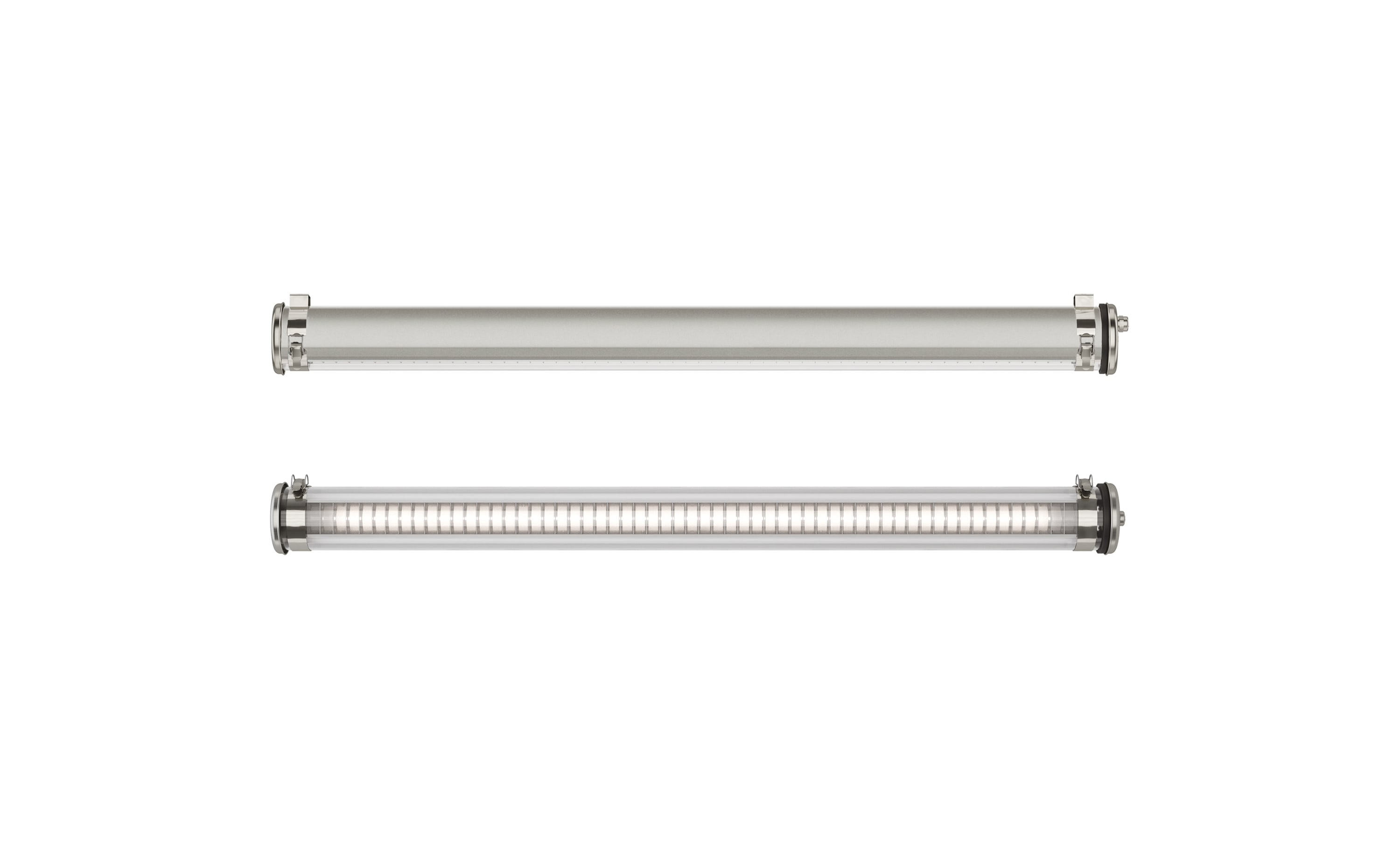 Luminaire tubulaire basse luminance Brueghel - Vasque : Polycarbonate qualité cristal - Les possibles traces de rayures ou lignes propres à l’extrusion du matériau plastique sont normales et ne constituent pas un défaut du produit. - Flasques, colliers, …: Inox 304L - Modules LED démontables à haute efficacité (IRC>80, 3 SDCM) - Flux lumineux: 3500 lm - Température de couleur: 3000 K - Optique primaire diffusante satinée spécifique - UGR ? 19 (luminaire en position plafonnier ou en suspension) - Défilement longitudinal : 30° - Défilement transversal : 30° - Driver à sortie en courant constant, non gradable - Diamètre : 100 mm - Longueur hors tout: 1607 mm - Entrée de câble par 1 prise débrochable 3x1,5mm² à verrouillage par bague vissée pour câble Ø 8 à 10 mm - Fixation par 2 colliers en inox à grenouillère (à entraxe variable) - Ouverture du produit partie éclairante vers le haut - Maintenance par desserrage des 2 vis de fermeture, démontage du flasque mobile et extraction de la platine - Modules LED et driver facilement démontables - Garantie 8 ans - 70 000 h L80/B10 à 25°C - Température d’utilisation : -20 °C à +35 °C - Étanchéité : IP66, IP68 et IP69K - Résistance aux chocs : IK10 - Classe électrique : Classe II - Tension d'alimentation : 220-240V 0/50/60Hz - Consommation: 29 W - Efficacité lumineuse: 121 lm/W - Facteur de puissance > 0,9 - THD: 16 % - Risque photobiologique : Groupe 0 - Pic de courant d'appel: 32 A - Durée du courant d'appel à 50% du pic: 240 µs - Résistance au feu : 850 °C - Nombre de drivers sur MCB type B 16A: 16 pcs - Poids: 4,7 kg - Conçu et fabriqué en France