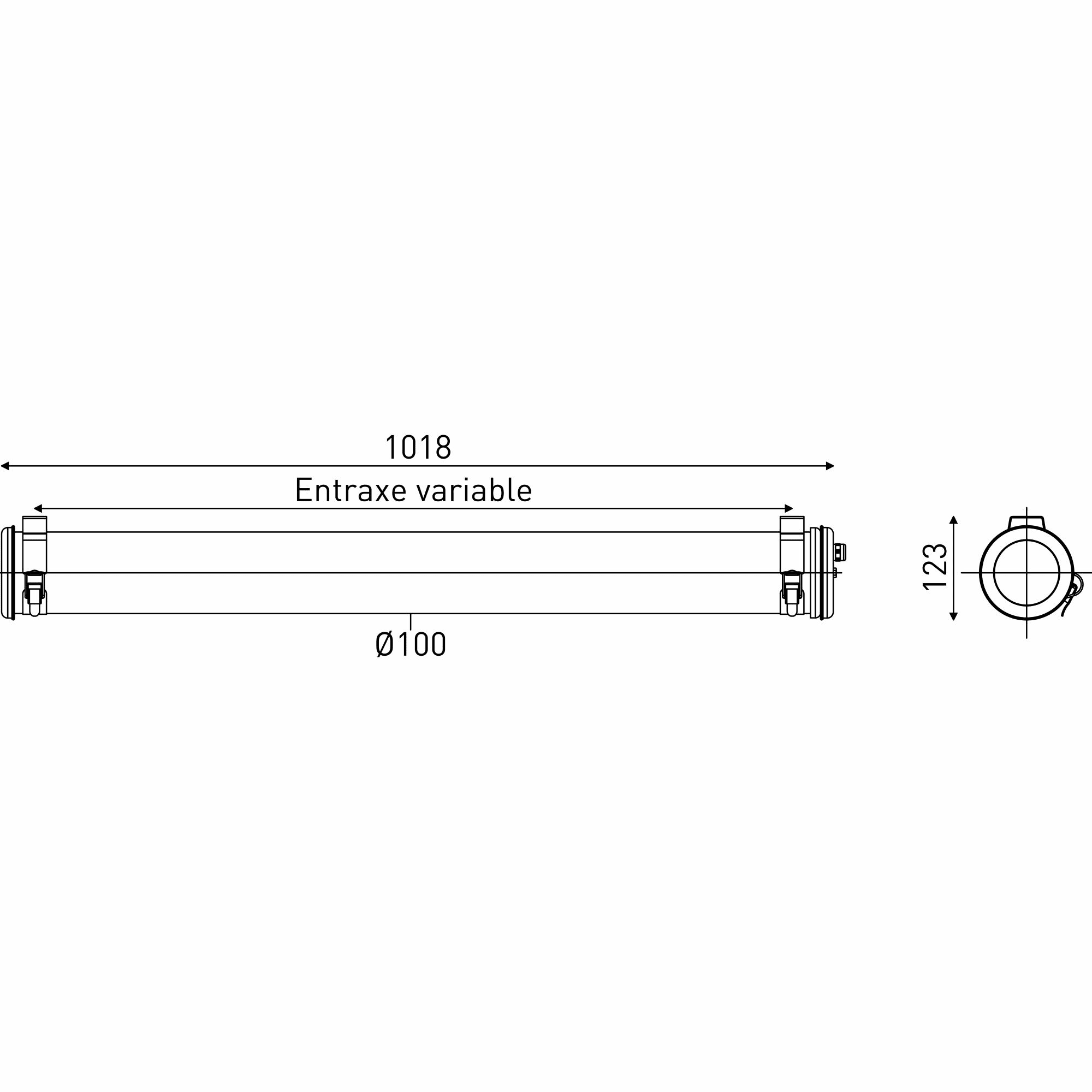 Luminaire tubulaire pour éclairage général PISSARRO 100 - Vasque : Coextrudé de polycarbonate/PMMA insensible aux UV pour un usage intérieur/extérieur - Flasques & Colliers : Inox 304L - Grille de défilement longitudinale en aluminium brossé - Platine interne en tôle d’acier laquée grise RAL 9006 - Joints : Joints moulés en EPDM - Modules LED démontables à haute efficacité (IRC>80, 3 SDCM) - Flux lumineux: 2100 lm - Température de couleur: 4000 K - Optique primaire diffusante satinée spécifique - UGR ? 22 - Défilement longitudinal : 30° - Driver à sortie en courant constant, non gradable - Diamètre : 100 mm - Longueur hors tout: 1018 mm - Entrée de câble par presse-étoupe en laiton nickelé pour câble Ø 5 à 14 mm - Raccordement sur bornier débrochable 3 x 2,5 mm² - Fixation par colliers renforcés en inox à grenouillère à entraxe variable et permettant une orientation sur 360° - Ouverture et fermeture rapide par une seule vis - Maintenance par système de tiroir (breveté) - Installation verticale : presse-étoupe vers le bas - Modules LED et driver facilement démontables - Garantie 8 ans - 70 000 h L80/B10 à 25°C - Température d’utilisation : -20 °C à +35 °C - Étanchéité : IP66, IP68 et IP69K - Résistance aux chocs : IK10 - Classe électrique : Classe II - Tension d'alimentation : 220-240V 0/50/60Hz - Consommation: 24 W - Efficacité lumineuse: 88 lm/W - Facteur de puissance > 0,85 - THD: 20 % - Risque photobiologique : Groupe 0 - Pic de courant d'appel: 32 A - Durée du courant d'appel à 50% du pic: 240 µs - Résistance au feu : 650 °C - Nombre de drivers sur MCB type B 16A: 16 pcs - Poids: 3 kg