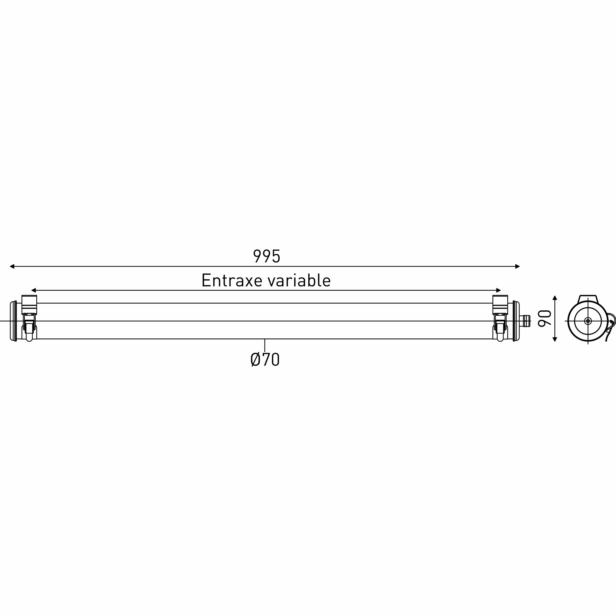 Plafonnier à flux dirigé PURCELL - Vasque : Polycarbonate qualité cristal - Flasques & Colliers : Inox 304L - Grille de défilement longitudinale en aluminium brossé - Platine interne en tôle d’acier laquée grise RAL 9006 - Joints : Joints moulés en EPDM - Modules LED démontables à haute efficacité (IRC>80, 3 SDCM) - Flux lumineux: 1500 lm - Température de couleur: 3000 K - Optique primaire diffusante satinée spécifique - UGR ? 22 - Défilement longitudinal : 25° - Driver à sortie en courant constant, non gradable - Diamètre : 70 mm - Longueur hors tout: 995 mm - Entrée de câble par presse-étoupe en laiton nickelé pour câble Ø 8 à 12 mm - Raccordement par bornier 3x2,5mm² solidaire du flasque de fermeture - Fixation par colliers renforcés en inox à grenouillère à entraxe variable et permettant une orientation sur 360° - Fermeture par serrage de l’écrou sous presse-étoupe - Ouverture et fermeture rapide par une seule vis - Système breveté de connexion/déconnexion électrique automatique à la fermeture - Installation verticale : presse-étoupe vers le bas - Maintenance sans intervention sur le câble par extraction de la platine par le côté opposé à l'alimentation - Modules LED et driver facilement démontables - Garantie 8 ans - 70 000 h L80/B10 à 25°C - Température d’utilisation : -25 °C à +35 °C - Étanchéité : IP66, IP68 et IP69K - Résistance aux chocs : IK10 - Classe électrique : Classe II - Tension d'alimentation : 220-240 V 50/60 Hz - Consommation: 14 W - Facteur de puissance > 0,85 - THD: 30 % - Risque photobiologique : Groupe 0 - Pic de courant d'appel: 32 A - Durée du courant d'appel à 50% du pic: 240 µs - Résistance au feu : 960 °C - Nombre de drivers sur MCB type B 16A: 16 pcs - Poids: 2,1 kg - Conçu et fabriqué en France