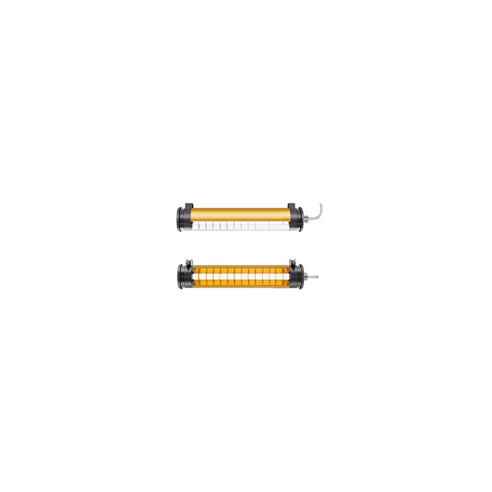 Plafonnier à flux dirigé PURCELL - Cache-appareillage interne roulé en aluminium anodisé : BRASS - Vasque : Coextrudé de polycarbonate/PMMA insensible aux UV pour un usage intérieur/extérieur - Flasques & Colliers : Inox 304L - Grille de défilement longitudinale en aluminium couleur laiton - Platine interne en tôle d’acier laquée grise RAL 9006 - Joints : Joints moulés en EPDM - Modules LED démontables à haute efficacité (IRC>80, 3 SDCM) - Flux lumineux: 350 lm - Température de couleur: 2700 K - Optique primaire diffusante satinée spécifique - UGR ? 22 - Défilement longitudinal : 25° - Driver à sortie en courant constant, non gradable - Diamètre : 70 mm - Longueur hors tout: 430 mm - Entrée de câble par presse-étoupe en laiton nickelé pour câble Ø 8 à 12 mm - Raccordement sur bornier automatique 2x2,5mm² - Fixation par colliers renforcés en inox à grenouillère à entraxe variable et permettant une orientation sur 360° - Ouverture et fermeture par serrage de l’écrou sous presse-étoupe - Installation verticale : presse-étoupe vers le bas - Modules LED et driver facilement démontables - Garantie 8 ans - 70 000 h L80/B10 à 25°C - Température d’utilisation : -25 °C à +35 °C - Étanchéité : IP66, IP68 et IP69K - Résistance aux chocs : IK10 - Classe électrique : Classe II - Tension d'alimentation : 220-240 V 50/60 Hz - Consommation: 5 W - Facteur de puissance > 0,75 - THD: 26 % - Risque photobiologique : Groupe 0 - Pic de courant d'appel: 5 A - Durée du courant d'appel à 50% du pic: 50 µs - Résistance au feu : 650 °C - Nombre de drivers sur MCB type B 16A: 50 pcs - Poids: 1,5 kg - Conçu et fabriqué en France