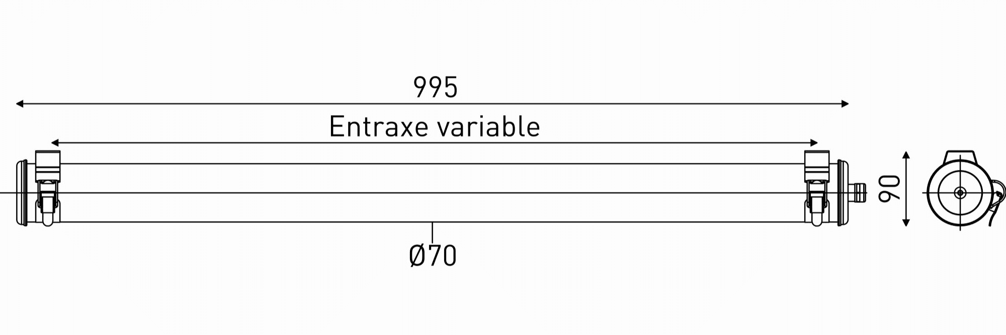 Luminaire tubulaire à flux dirigé Scorel - Vasque : Polycarbonate qualité cristal - Flasques & Colliers : Inox 304L - Réflecteur extensif en aluminium grand brillant - Dissipateur thermique passif en aluminium - Platine interne en tôle d’acier laquée grise RAL 9006 - Joints : Joints moulés en EPDM - Modules LED démontables à haute efficacité (IRC>80, 3 SDCM) - Flux lumineux: 1500 lm - Température de couleur: 2700 K - Optique primaire diffusante satinée spécifique limitant l'intensité axiale - Light mixing chamber - UGR ? 25 - Sans nuisance lumineuse pour l’éclairage extérieur : ULR = 0% - Orientation max pour ULR < 4% : 30° en position horizontale - FC3 = 98% - Driver à sortie en courant constant, gradable selon protocole DALI 2 - Diamètre : 70 mm - Longueur hors tout: 995 mm - Entrée de câble par presse-étoupe en laiton nickelé pour câble Ø 8 à 12 mm - Raccordement sur bornier débrochable 5 x 2,5 mm² - Fixation par 2 Colliers en inox à vis Torx Tamper (à entraxe variable) - Fermeture par serrage de l’écrou sous presse-étoupe - Ouverture et fermeture rapide par une seule vis - Système breveté de connexion/déconnexion électrique automatique à la fermeture - Maintenance sans intervention sur le câble par extraction de la platine par le côté opposé à l'alimentation - Modules LED et driver facilement démontables - Garantie 8 ans - 70 000 h L80/B10 à 25°C - Température d’utilisation : -25 °C à +35 °C - Étanchéité : IP66, IP68 et IP69K - Résistance aux chocs : IK10 - Classe électrique : Classe I - Tension d'alimentation : 220-240V 0/50/60Hz - Consommation: 15 W - Efficacité lumineuse: 100 lm/W - Facteur de puissance > 0,85 - THD: 20 % - Risque photobiologique : Groupe 0 - Pic de courant d'appel: 17 A - Durée du courant d'appel à 50% du pic: 170 µs - Résistance au feu : 960 °C - Nombre de drivers sur MCB type B 16A: 28 pcs - Poids: 2,4 kg - Conçu et fabriqué en France