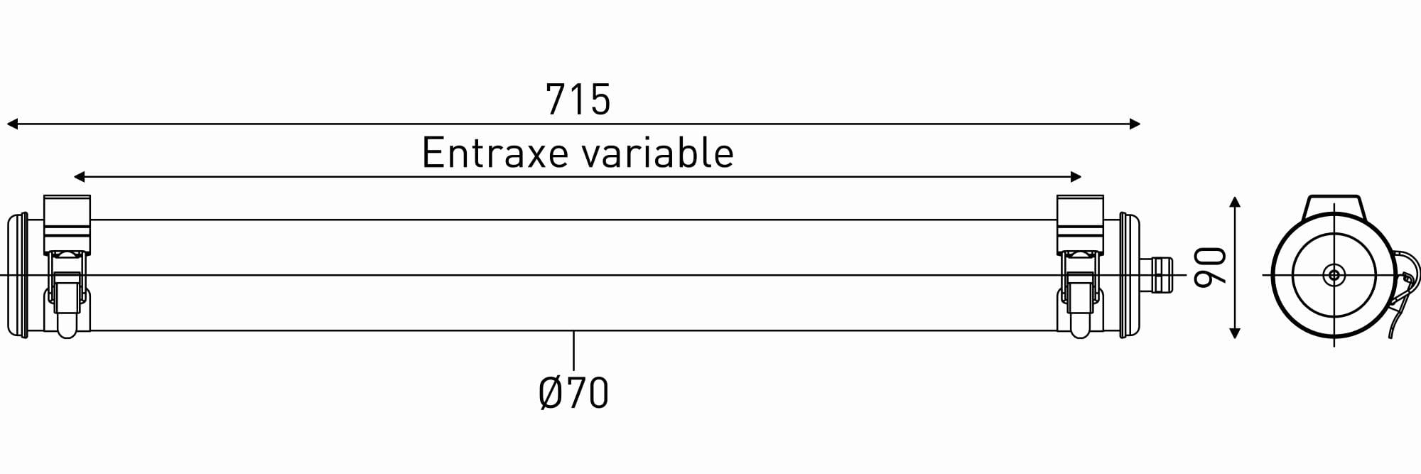 Luminaire tubulaire à flux dirigé Scorel - Vasque : Polycarbonate qualité cristal - Flasques & Colliers : Inox 304L - Réflecteur extensif en aluminium grand brillant - Dissipateur thermique passif en aluminium - Platine interne en tôle d’acier laquée grise RAL 9006 - Joints : Joints moulés en EPDM - Modules LED démontables à haute efficacité (IRC>80, 3 SDCM) - Flux lumineux: 1000 lm - Température de couleur: 3000 K - Optique primaire diffusante satinée spécifique limitant l'intensité axiale - Light mixing chamber - UGR ? 25 - Sans nuisance lumineuse pour l’éclairage extérieur : ULR = 0% - Orientation max pour ULR < 4% : 30° en position horizontale - FC3 = 98% - Driver à sortie en courant constant avec fonction préavis d'extinction (pour détecteur/minuterie) - Diamètre : 70 mm - Longueur hors tout: 715 mm - Entrée de câble par presse-étoupe en laiton nickelé pour câble Ø 8 à 12 mm - Raccordement sur bornier débrochable 5 x 2,5 mm² - Fixation par 2 colliers en inox à grenouillère (à entraxe variable) - Fermeture par serrage de l’écrou sous presse-étoupe - Ouverture et fermeture rapide par une seule vis - Système breveté de connexion/déconnexion électrique automatique à la fermeture - Maintenance sans intervention sur le câble par extraction de la platine par le côté opposé à l'alimentation - Modules LED et driver facilement démontables - Garantie 8 ans - 70 000 h L80/B10 à 25°C - Température d’utilisation : -25 °C à +35 °C - Étanchéité : IP66, IP68 et IP69K - Résistance aux chocs : IK10 - Classe électrique : Classe I - Tension d'alimentation : 220-240V 0/50/60Hz - Consommation: 11 W - Efficacité lumineuse: 91 lm/W - Facteur de puissance > 0,75 - THD: 20 % - Risque photobiologique : Groupe 0 - Pic de courant d'appel: 13,6 A - Durée du courant d'appel à 50% du pic: 304 µs - Résistance au feu : 960 °C - Nombre de drivers sur MCB type B 16A: 28 pcs - Poids: 1,9 kg - Conçu et fabriqué en France