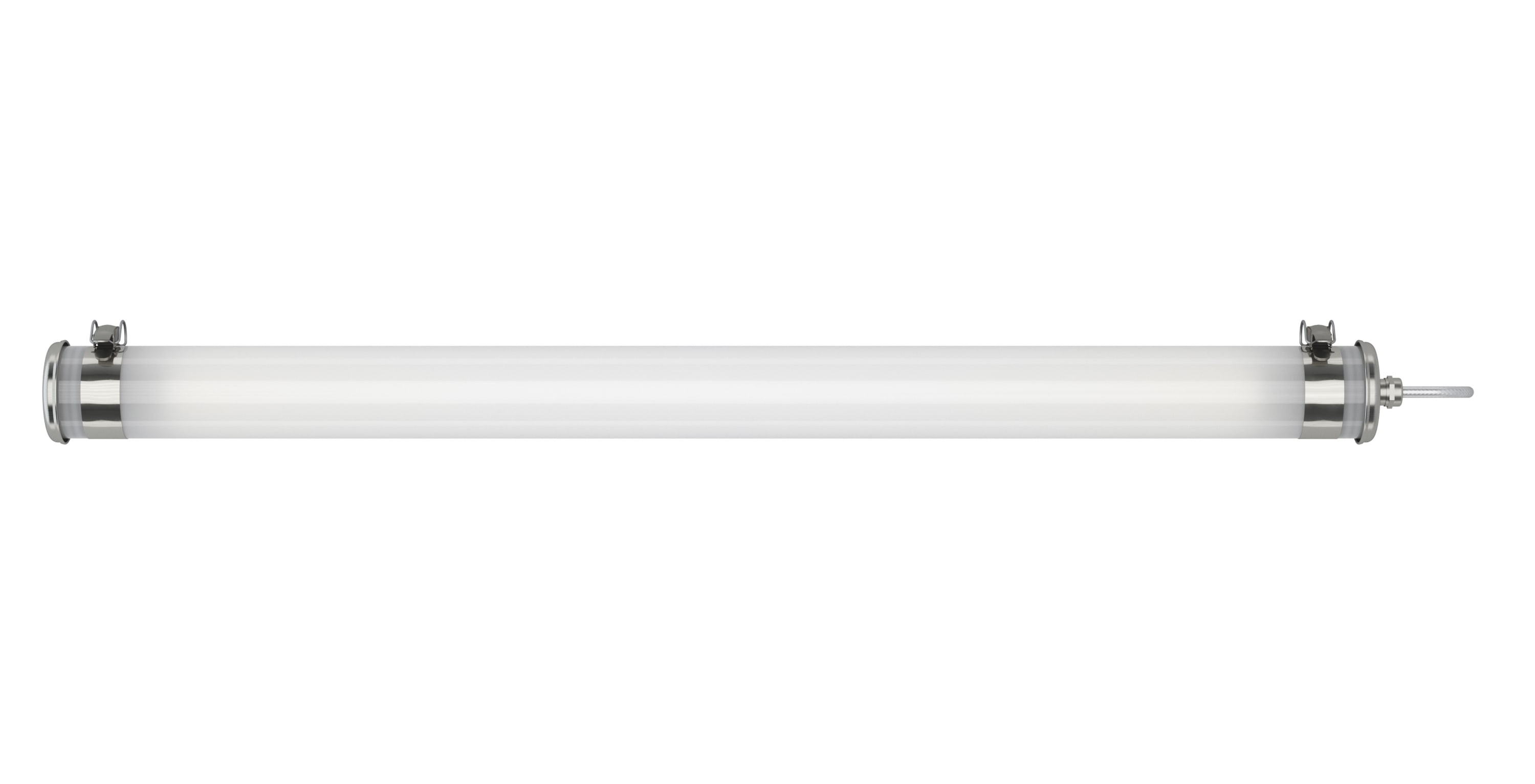 Luminaire tubulaire pour éclairage diffus Turner - Vasque : Polycarbonate satiné spécial LED - Flasques, colliers, …: Inox 304L - Dissipateur thermique passif en aluminium - Joints : Joints moulés en EPDM - Modules LED démontables à haute efficacité (IRC>80, 3 SDCM) - Flux lumineux: 2000 lm - Température de couleur: 3000 K - Gestion des luminances par utilisation d'une vasque diffusante - Light mixing chamber - UGR = 25 (luminaire en position plafonnier ou en suspension) - Driver à sortie en courant constant, gradable selon protocole DALI - Diamètre : 70 mm - Longueur hors tout: 1275 mm - Entrée de câble par presse-étoupe en laiton nickelé pour câble Ø 5 à 12 mm - Raccordement sur bornier débrochable 5 x 2,5 mm² - Fixation par 2 Colliers en inox à vis Torx Tamper (à entraxe variable) - Fermeture par serrage de l’écrou sous presse-étoupe - Ouverture et fermeture rapide par une seule vis - Maintenance sans intervention sur le câble par extraction de la platine du côté opposé à l’alimentation - Système breveté de connexion/déconnexion électrique automatique à la fermeture - Installation verticale : presse-étoupe vers le bas - Maintenance sans intervention sur le câble par extraction de la platine par le côté opposé à l'alimentation - Modules LED et driver facilement démontables - Garantie 5 ans - 50 000 h L80/B10 à 25°C - Température d’utilisation : -25 °C à +35 °C - Étanchéité : IP66, IP68 et IP69K - Résistance aux chocs : IK10 - Classe électrique : Classe I - Alimentation : 220-240 V 50/60 Hz - Consommation: 19 W - Efficacité lumineuse: 105 lm/W - Facteur de puissance > 0,9 - THD: 17 % - Risque photobiologique : Groupe 0 - Résistance au feu : 960 °C - Poids: 2,3 kg
