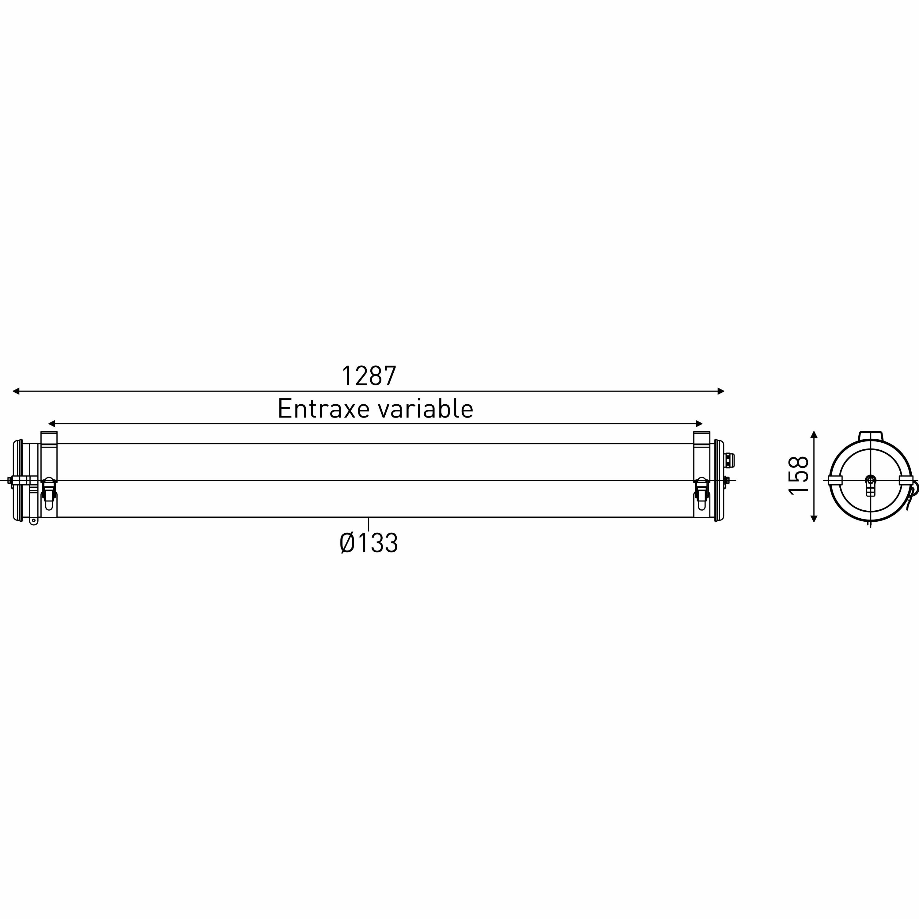 Luminaire tubulaire SABATIER pour ambiances explosibles classées Zone 1 - Flasques inox en forme de 1/2 tore creux - Vasque Ø133 mm en polycarbonate protégé des UV, des solvants, des hydrocarbures et des agents lessiviels par une coextrusion de méthacrylate - Platine d'appareillage en tôle d'acier laquée blanche - Dissipateur thermique en aluminium - Joints moulés en EPDM - Modules LED démontables à haute efficacité (IRC>80, 50 000h L80/B10@Tmax) - Flux lumineux: 4100 lm - Température de couleur : 4000K - Optique primaire diffusante satinée spécifique - Driver LED non réglable - Compatible sans restriction avec régimes de neutre TN, TT et IT - Diamètre : 133 mm - Longueur hors tout: 1287 mm - Entrée de câble par 2 presse-étoupes ATEX en polyamide, dont un obturé, pour câblage en repiquage (capacité : Ø6,5 à 14 mm). Ampérage Max 10A - Raccordement par 5 borniers 2x4mm² - Goujon soudé sur flasque d’entrée pour éventuelle liaison équipotentielle - Fixation par colliers renforcés en inox à grenouillère à entraxe variable et permettant une orientation sur 360° - Ouverture hors tension en zone explosible - Maintenance par desserrage des 2 vis de fermeture, démontage du flasque mobile et extraction de la platine - Garantie : 5 ans, en usage 24/7 à temp max - Température d'utilisation : -20°C +50°C - Indice de protection : IP66/IP68/IP69K - Résistance aux chocs : IK10 - Classe I - Tension d'alimentation : 220-240V 50/60Hz - Consommation: 35 W - Efficacité lumineuse: 117 lm/W - Facteur de puissance > 0,95 - THD: 7,5 % - Pic de courant d'appel: 22 A - Durée du courant d'appel à 50% du pic: 200 µs - Résistance au feu : 650 °C - Résistance aux vibrations : Conforme aux conditions sévères de l’EN 60598-1 (tests selon CEI 60068-2-6) - Nombre de drivers sur MCB type B 16A: 24 pcs - Poids: 4,9 kg - Certifié ATEX (Licence INERIS 19ATEX0002X) - II 2G Ex eb mb IIC T5 Gb (Zones 1&2) - II 2D Ex tb IIIC T80°C Db IP66 (Zones 21&22) - Classe de température : T5 (Gaz) - Certifié IECEx (Licence IECEx INE 19.0004X) - Conçu et fabriqué en France