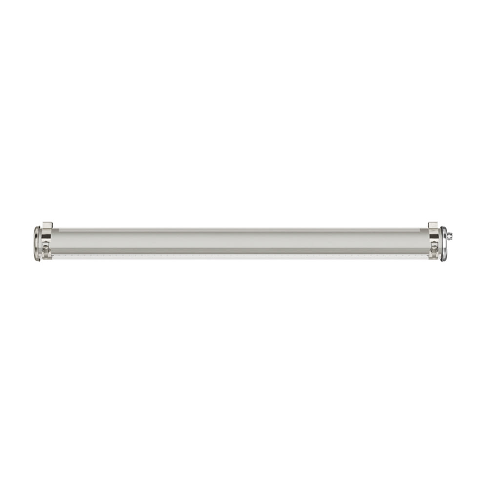 Luminaire tubulaire basse luminance Brueghel Direct/Indirect - Cache-appareillage interne roulé en aluminium anodisé : SILVER - Vasque : Polycarbonate qualité cristal - Les possibles traces de rayures ou lignes propres à l’extrusion du matériau plastique sont normales et ne constituent pas un défaut du produit. - Flasques, colliers, …: Inox 304L - Modules LED démontables à haute efficacité (IRC>80, 3 SDCM) - Flux lumineux : 4200 lm total dont 1400 lm en indirect - Température de couleur: 4000 K - Optique primaire diffusante satinée spécifique - UGR = 19 (luminaire en position plafonnier ou en suspension) - Défilement longitudinal : 30° - Défilement transversal : 30° - Equipé de 2 drivers à courant constant pour allumage direct et indirect groupé ou indépendant - 1 luminaire, 3 ambiances- Driver gradable selon protocole DALI 2 adresses - Diamètre : 100 mm - Longueur hors tout: 1307 mm - Entrée de câble par 1 prise débrochable 5x1,5mm² à verrouillage par bague vissée pour câble Ø 8 à 10 mm - Fixation par 2 colliers en inox à grenouillère (à entraxe variable) - Livré avec 2 kits de suspension intégrant : un système d'accrochage sur plafond, 3 m de filin acier de Ø 1,2 mm et un système de fixation sur colliers avec dispositif de réglage - Maintenance par desserrage des 2 vis de fermeture, démontage du flasque mobile et extraction de la platine - Modules LED et driver facilement démontables - Garantie 5 ans - 50 000 h L80/B10 à 25°C - Température d’utilisation : -25 °C à +35 °C - Étanchéité : IP66, IP68 et IP69K - Résistance aux chocs : IK10 - Classe électrique : Classe II - Alimentation : 220-240 V 50/60 Hz - Consommation: 37 W - Risque photobiologique : Groupe 0 - Résistance au feu : 850 °C - Poids: 3,8 kg - Conçu et fabriqué en France