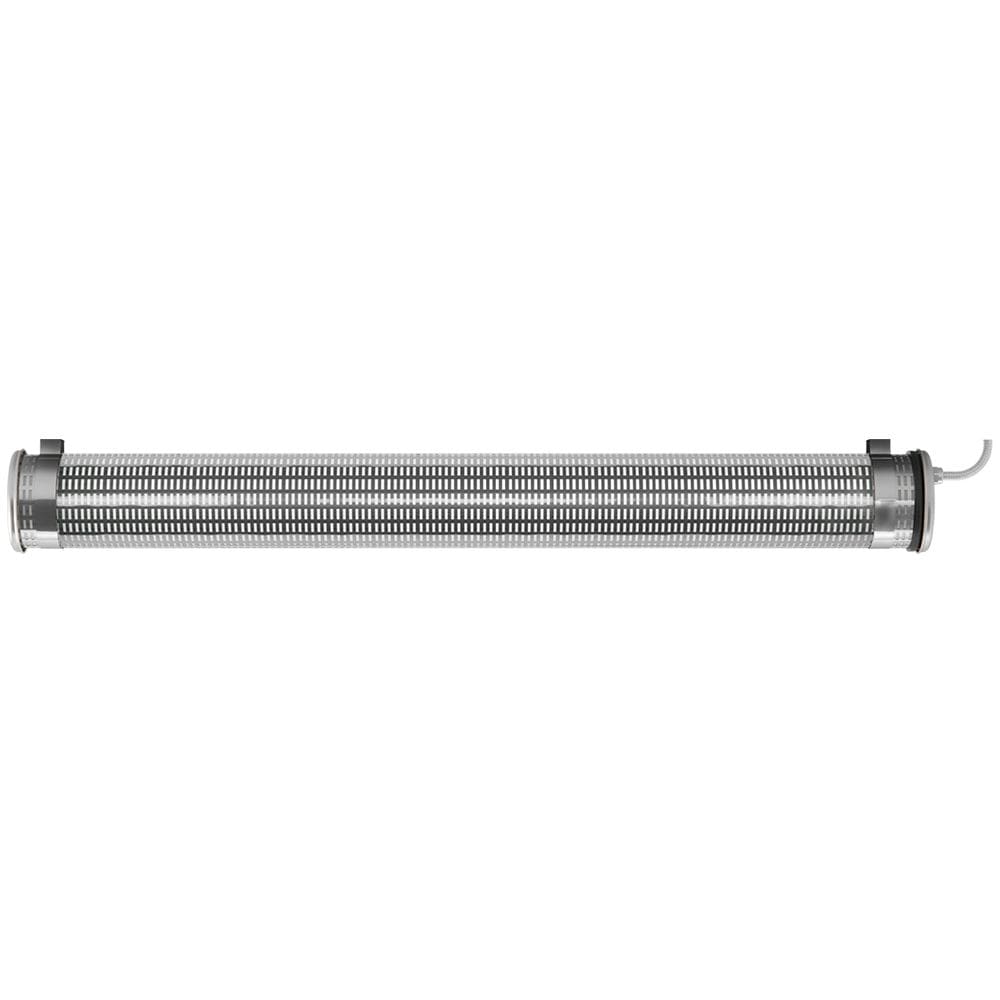 Suspension tubulaire KYHN 133 360° (design : Dominique Perrault & Gaëlle Lauriot-Prévost) - Pour éclairage omnidirectionnel avec grille à perforation rectangulaire - Grille finition SILVER - Vasque : Coextrudé de polycarbonate/PMMA insensible aux UV pour un usage intérieur/extérieur - Flasques & Colliers : Inox 316L - Grille en inox insérée entre la vasque et un film interne en polycarbonate blanc opalisé - Toute partie métallique externe en inox 316L et visserie en inox A4 - Platine interne en tôle d’acier laquée blanche - Dissipateur thermique passif en aluminium - Joints : Joints moulés en EPDM - Modules LED démontables à haute efficacité (IRC>80, 3 SDCM) - Flux lumineux: 2000 lm - Température de couleur: 2700 K - Optique primaire diffusante satinée spécifique - UGR ? 19 - Driver à sortie en courant constant, non gradable - Diamètre : 133 mm - Longueur hors tout: 1595 mm - Entrée de câble par presse-étoupe en laiton nickelé pour câble Ø 5 à 14 mm - Fourni équipé de 3m de câble 3G1,5 avec tresse en cuivre étamé sous gaine transparente - Fixation par 2 colliers renforcés en inox à grenouillère (à entraxe variable) et permettant une orientation sur 360° - Livré avec 2 kits de suspension intégrant : un système d'accrochage sur plafond, 3 m de filin acier de Ø 1,2 mm et un système de fixation sur colliers avec dispositif de réglage - Fourni avec un boitier de sortie murale en inox 316L, usage intérieur (IP 40), à raccorder à la terre - Ouverture et fermeture rapide par une seule vis - Maintenance par système de tiroir (breveté) - Modules LED et driver démontables - Garantie 5 ans - 50 000 h L80/B10 à 25°C - Température d'utilisation : -20°C à +30°C - Indice de protection : IP66/IP68/IP69K - Résistance aux chocs : IK10 - Classe électrique : Classe I - Tension d'alimentation : 220-240V 0/50/60Hz - Consommation: 52 W - Risque photobiologique : Groupe 0 - Pic de courant d'appel: 57,7 A - Durée du courant d'appel à 50% du pic: 217 µs - Résistance au fil incandescent : 650°C - Nombre de drivers sur MCB type B 16A: 10 pcs - Poids: 7,5 kg - Conçu et fabriqué en France