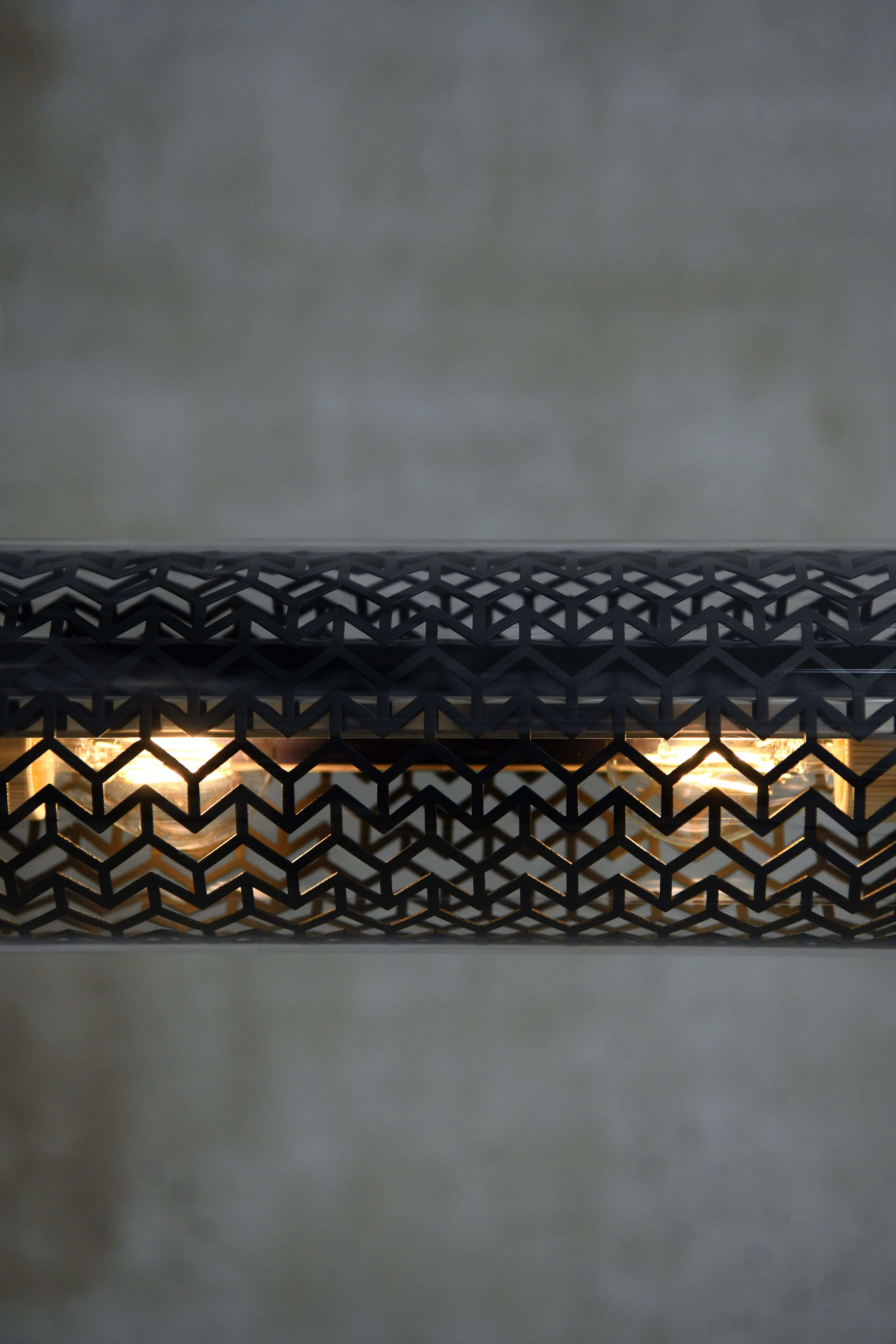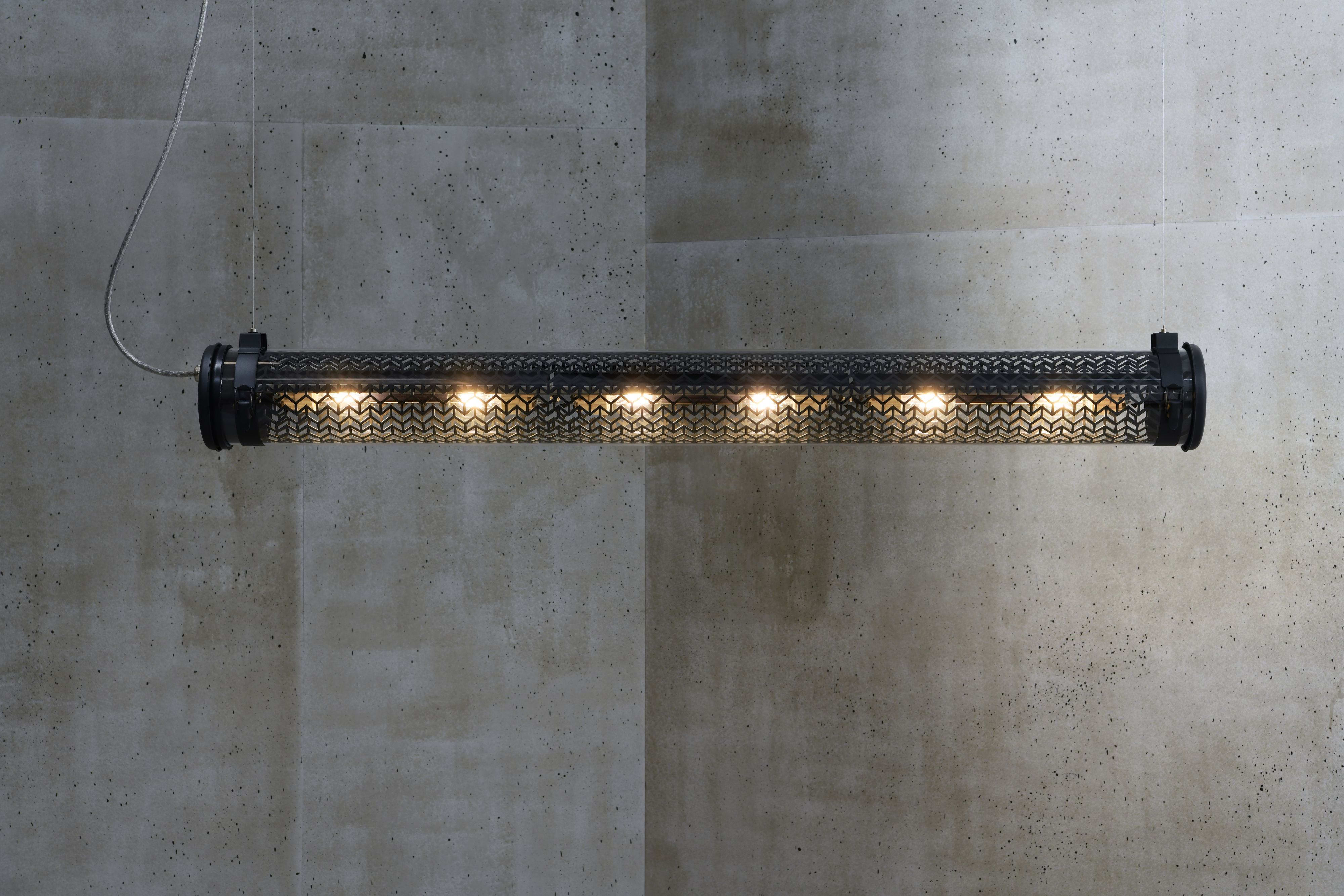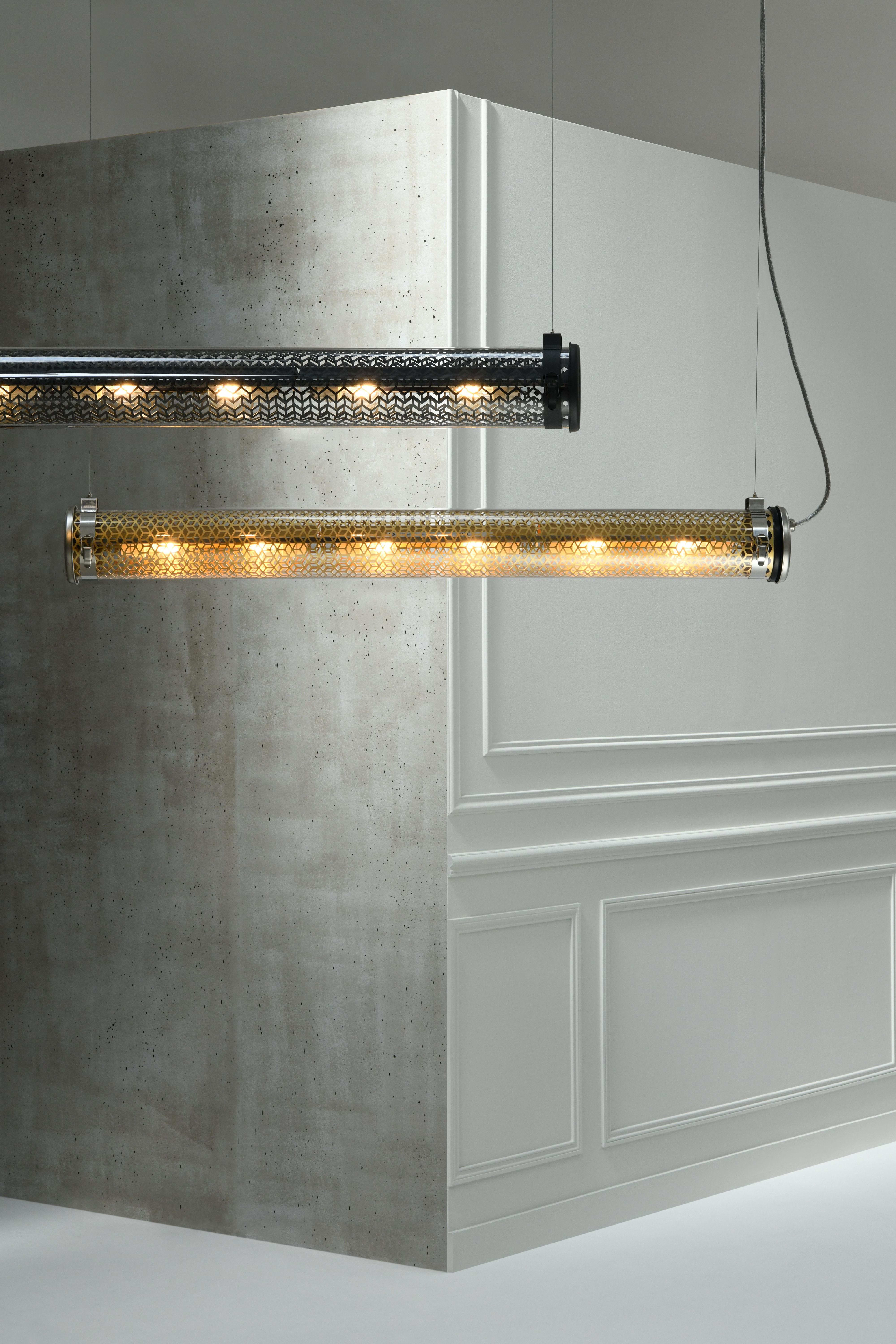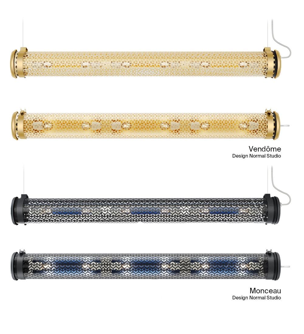 Luminaire tubulaire diamètre 133 à grille multiperforée et ampoules LED, hautement décoratif, idéal en suspension. Lignes épurées, finitions haut de gamme et qualité industrielle des matériaux, pour offrir une signature unique, durable et résolument contemporaine à vos espaces intérieurs ou extérieurs.La collection Paname, dessinée en hommage à la ville lumière, rassemble 4 familles de luminaires, construites autour de différents motifs de grilles . La suspension Monceau et sa grille à chevrons rappellent le motif point de Hongrie des parquets anciens qui font tout le charme des beaux quartiers parisiens. Ce luminaire est disponible en deux finitions. Mariant le laiton et l’inox, sa version Brass aux doux reflets dorés enveloppera vos espaces d’une atmosphère douce et chaleureuse. Pour une ambiance post-industrielle hyper tendance, vous opterez plutôt pour sa version Coal, dont les teintes sombres habillent les colliers de fixation, les flasques, mais aussi la grille multiperforée et 3 réflecteurs brossés aux surprenants reflets gris-bleutés. Suspendu à ses filins en acier au-dessus de votre table de salle à manger ou dans votre cuisine, subtilement mis en lumière par ses 6 ampoules à filaments LED, le luminaire Monceau vous invite à plonger dans l’univers des grands appartements haussmanniens.Ce luminaire est livré prêt pour l’installation et est équipé de son câble, de sa source et d’une sortie murale. Tous nos luminaires sont fabriqués, assemblés et emballés dans notre usine à Châtillon-sur-Saône dans les Vosges. Design : Normal Studio.