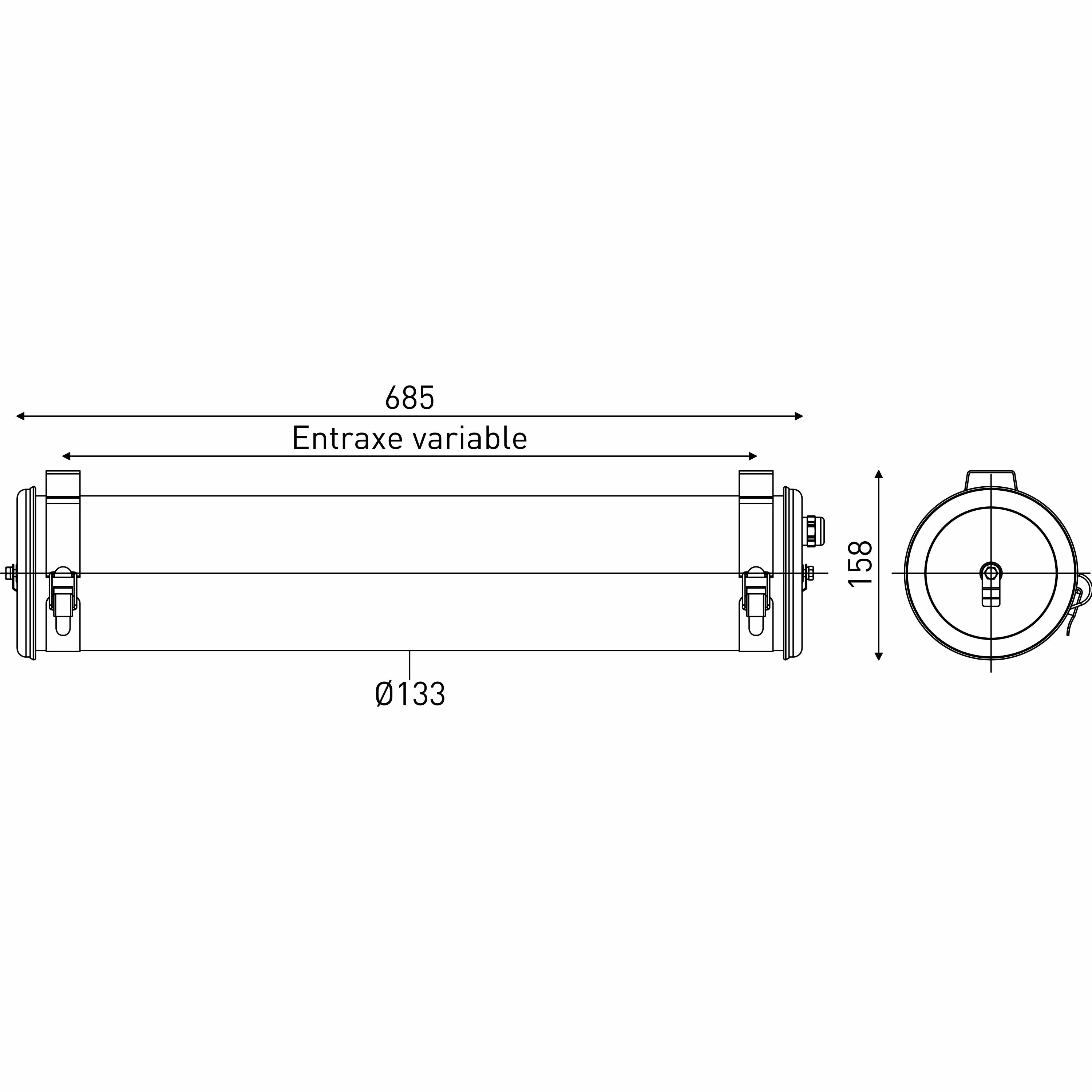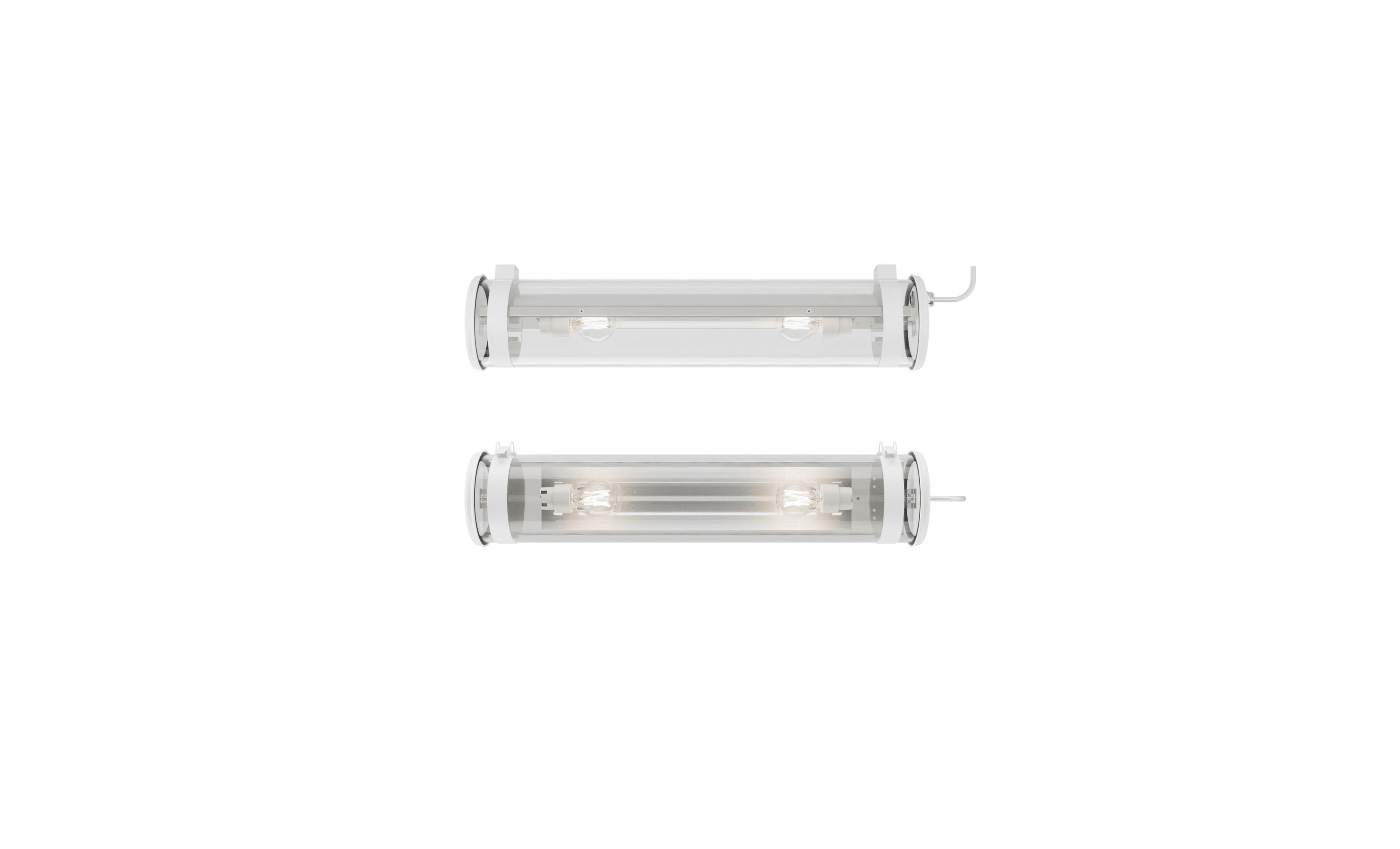 Luminaire tubulaire d’ambiance RIMBAUD - Couleur : WHITE (RAL 9010) - Flasques & Colliers : Inox 316L laqués WHITE (RAL 9010) - Réflecteur en aluminium anodisé : SILVER - Vasque Ø135 mm en verre borosilicaté - Toute partie métallique externe en inox 316L et visserie en inox A4 - Platine inox avec 2 douilles porcelaine E27 - Joints moulés en EPDM - Câblage interne haute température à isolation silicone tressée fibre de verre - Avec 2 lampes filament LED E27 4W 2700K claires - Flux lumineux: 600 lm - Température de couleur: 2700 K - Longueur hors tout: 677 mm - Fourni équipé de 3m de câble 3G1,5 avec tresse en cuivre étamé sous gaine transparente - Fixation par 2 colliers renforcés en inox à grenouillère (à entraxe variable) et permettant une orientation sur 360° - Livré avec 2 kits de suspension intégrant : un système d'accrochage sur plafond, 3 m de filin acier de Ø 1,2 mm et un système de fixation sur colliers avec dispositif de réglage - Fourni avec un boitier de sortie murale en inox 316L, usage intérieur (IP 40), à raccorder à la terre - Installation en position verticale, presse-étoupe vers le bas - Maintenance par desserrage des 2 vis de fermeture, démontage du flasque mobile et extraction de la platine - Garantie 5 ans - Température d'utilisation : -20°C à +30°C - Indice de protection : IP66/IP68/IP69K - Résistance aux chocs : IK07 - Classe électrique : Classe I - Alimentation : 220-240V 50/60Hz - Consommation: 8 W - Résistance au fil incandescent : Ininflammable - Poids: 5,8 kg