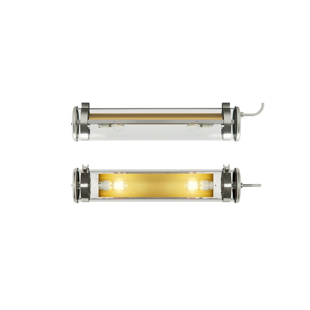 Luminaire tubulaire d’ambiance RIMBAUD - Flasques & Colliers : Inox 316L - Réflecteur en aluminium anodisé : BRASS - Vasque Ø135 mm en verre borosilicaté - Toute partie métallique externe en inox 316L et visserie en inox A4 - Platine inox avec 2 douilles porcelaine E27 - Joints moulés en EPDM - Câblage interne haute température à isolation silicone tressée fibre de verre - Avec 2 lampes filament LED E27 4W 2700K claires - Flux lumineux: 550 lm - Température de couleur: 2700 K - Gradation par un module CASAMBI intégré - Longueur hors tout: 677 mm - Fourni équipé de 3m de câble 3G1,5 avec tresse en cuivre étamé sous gaine transparente - Fixation par 2 colliers renforcés en inox à grenouillère (à entraxe variable) et permettant une orientation sur 360° - Livré avec 2 kits de suspension intégrant : un système d'accrochage sur plafond, 3 m de filin acier de Ø 1,2 mm et un système de fixation sur colliers avec dispositif de réglage - Fourni avec un boitier de sortie murale en inox 316L, usage intérieur (IP 40), à raccorder à la terre - Installation en position verticale, presse-étoupe vers le bas - Maintenance par desserrage des 2 vis de fermeture, démontage du flasque mobile et extraction de la platine - Garantie 5 ans - Température d'utilisation : -20°C à +30°C - Indice de protection : IP66/IP68/IP69K - Résistance aux chocs : IK07 - Classe électrique : Classe I - Alimentation : 220-240V 50/60Hz - Consommation: 8 W - Résistance au fil incandescent : Ininflammable - Poids: 5,9 kg