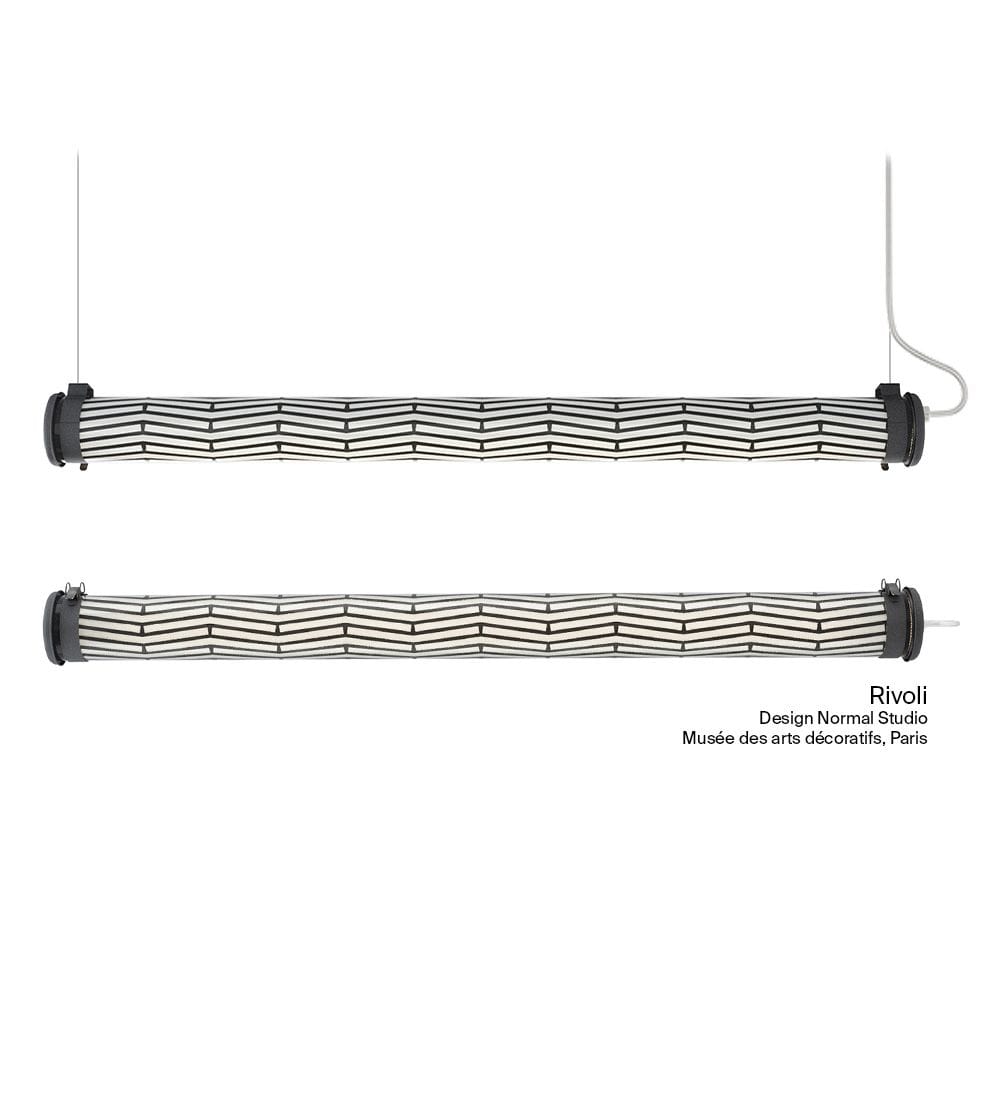 Luminaire tubulaire RIVOLI réalisé pour le Musée des Arts Décoratifs, Paris. (Design : Normal Studio) - Vasque : Coextrudé de polycarbonate/PMMA insensible aux UV pour un usage intérieur/extérieur - Flasques & Colliers : Inox 316L laqués COAL (RAL 7021) - Grille en aluminium laqué COAL (RAL 7021) insérée entre la vasque et un film interne en polycarbonate blanc opalisé - Toute partie métallique externe en inox 316L et visserie en inox A4 - Dissipateur thermique passif en aluminium - Platine interne en tôle d’acier laquée blanche - Joints : Joints moulés en EPDM - Modules LED démontables à haute efficacité (IRC>80, 3 SDCM) - Flux lumineux: 1500 lm - Température de couleur: 2700 K - Optique primaire diffusante satinée spécifique - Driver à sortie en courant constant, non gradable - Diamètre : 100 mm - Longueur hors tout: 1318 mm - Fourni équipé de 3m de câble 3G1,5 avec tresse en cuivre étamé sous gaine transparente - Fixation par 2 colliers renforcés en inox à grenouillère (à entraxe variable) et permettant une orientation sur 360° - Livré avec 2 kits de suspension intégrant : un système d'accrochage sur plafond, 3 m de filin acier de Ø 1,2 mm et un système de fixation sur colliers avec dispositif de réglage - Fourni avec un boitier de sortie murale en inox 316L, usage intérieur (IP 40), à raccorder à la terre - Ouverture et fermeture rapide par une seule vis - Maintenance par système de tiroir (breveté) - Modules LED et driver facilement démontables - Garantie 5 ans - 50 000 h L80/B10 à 25°C - Température d'utilisation : -20°C à +30°C - Indice de protection : IP68 - Résistance aux chocs : IK10 - Classe électrique : Classe I - Tension d'alimentation : 220-240V 0/50/60Hz - Consommation: 25 W - Risque photobiologique : Groupe 0 - Pic de courant d'appel: 32 A - Durée du courant d'appel à 50% du pic: 240 µs - Résistance au feu : 650 °C - Nombre de drivers sur MCB type B 16A: 16 pcs - Poids: 3,9 kg