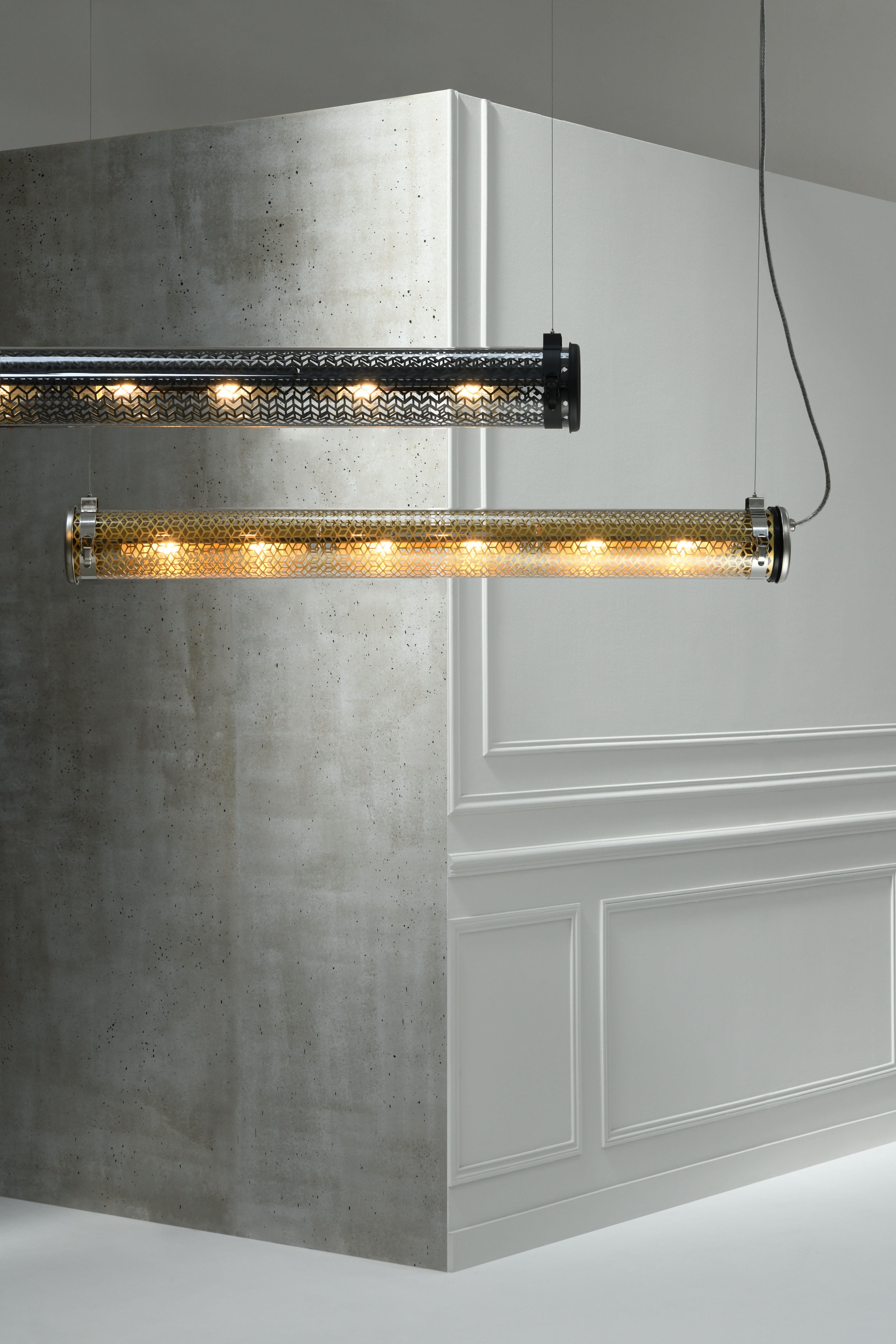 Luminaire tubulaire diamètre 133 à grille multiperforée et ampoules LED, hautement décoratif, idéal en suspension. Lignes épurées, finitions haut de gamme et qualité industrielle des matériaux, pour offrir une signature unique, durable et résolument contemporaine à vos espaces intérieurs ou extérieurs.La collection Paname, dessinée en hommage à la ville lumière, rassemble 4 familles de luminaires, construites autour de différents motifs de grilles . La suspension Vendôme, habillée d’une grille à motifs imbriqués, fait référence aux artères qui rejoignent la célèbre place parisienne, réputée pour ses grandes maisons de haute joaillerie. Ce luminaire est disponible en deux finitions. Mariant le laiton et l’inox, sa version Brass aux subtils reflets dorés enveloppera vos espaces d’une atmosphère douce et chaleureuse. Pour une ambiance post-industrielle hyper tendance, vous opterez plutôt pour sa version Coal, dont les teintes sombres habillent les colliers de fixation, les flasques, mais aussi la grille multiperforée et 3 réflecteurs brossés aux surprenants reflets gris-bleutés. Suspendu à ses filins en acier au-dessus de votre table de salle à manger ou dans votre cuisine, subtilement mis en lumière par ses 6 ampoules à filaments LED, le Vendôme est bien plus qu’un luminaire, c’est un véritable bijou.Ce luminaire est livré prêt pour l’installation et est équipé de son câble, de sa source et d’une sortie murale. Tous nos luminaires sont fabriqués, assemblés et emballés dans notre usine à Châtillon-sur-Saône dans les Vosges. Design : Normal Studio."