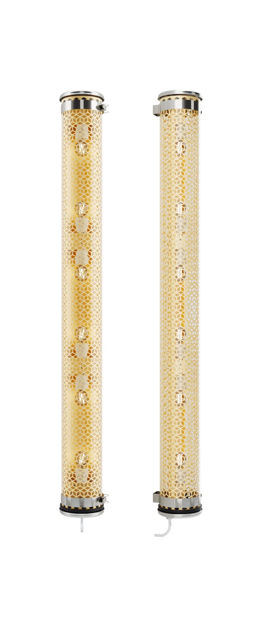 Luminaire tubulaire VENDOME avec grille à perforations nid d'abeille et flasques anodisées laiton 6 lampes filament LED E27 4W satinées dimmables 2700K IRC 80 1000lm 24W 5 ans 650°C Classe I 220-240V 50/60Hz