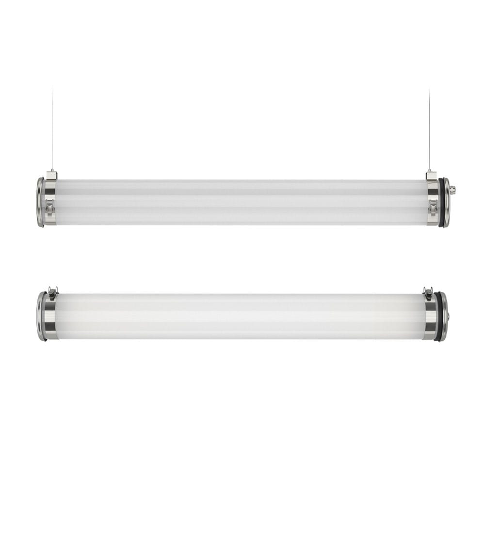 Suspension tubulaire WEREFKIN 133 360° pour éclairage omnidirectionnel - Vasque : Coextrudé de polycarbonate/PMMA insensible aux UV pour un usage intérieur/extérieur - Flasques & Colliers : Inox 304L - Platine interne en tôle d’acier laquée blanche - Dissipateur thermique passif en aluminium - Joints : Joints moulés en EPDM - Modules LED démontables à haute efficacité (IRC>80, 3 SDCM) - Flux lumineux: 4600 lm - Température de couleur: 3000 K - Optique primaire diffusante satinée spécifique - UGR ? 19 - Driver à sortie en courant constant, non gradable - Diamètre : 133 mm - Longueur hors tout: 1295 mm - Entrée de câble par presse-étoupe en laiton nickelé pour câble Ø 5 à 14 mm - Raccordement sur bornier débrochable 3 x 2,5 mm² - Fixation par 2 colliers renforcés en inox à grenouillère (à entraxe variable) et permettant une orientation sur 360° - Livré avec 2 kits de suspension intégrant : un système d'accrochage sur plafond, 3 m de filin acier de Ø 1,2 mm et un système de fixation sur colliers avec dispositif de réglage - Ouverture et fermeture rapide par une seule vis - Maintenance par système de tiroir (breveté) - Modules LED et driver démontables - Garantie 5 ans - 50 000 h L80/B10 à 25°C - Température d’utilisation : -25 °C à +35 °C - Indice de protection : IP66/IP68/IP69K - Résistance aux chocs : IK10 - Classe électrique : Classe II - Tension d'alimentation : 220-240V 0/50/60Hz - Consommation: 44 W - Risque photobiologique : Groupe 0 - Pic de courant d'appel: 30 A - Durée du courant d'appel à 50% du pic: 253 µs - Résistance au feu : 650 °C - Nombre de drivers sur MCB type B 16A: 16 pcs - Poids: 5,4 kg