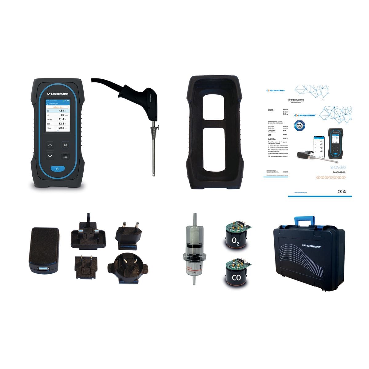 Analyseur de combustion Si-CA 030 Kit 2AH, avec 2 cellules (O2, CO), sonde 180 mm avec tuyau de 2 m, valise de transport et certificat d'étalonnage. Garantie 2 ans.
