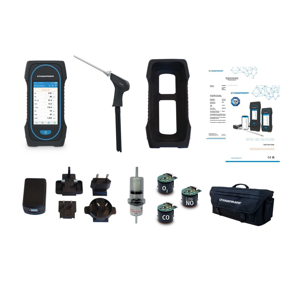Analyseur de combustion Si-CA 130 Kit 3LowBS avec 3 cellules (O2, CO, NO basse échelle), sonde 300 mm avec tuyau de 3 m, sacoche de transport et certificat d'étalonnage. Garantie 2 ans.