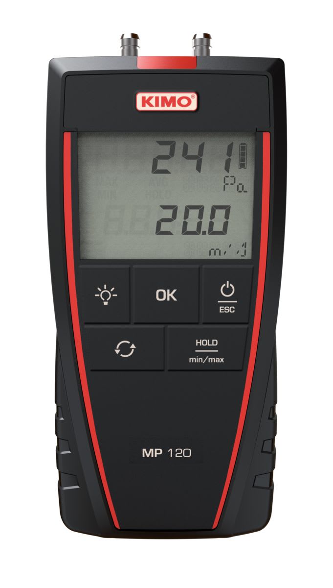 Anémo-Manomètre portable MP120 pour mesure de la pression différentielle de 0 à ±1000Pa et de la vitesse de 2 à 40m/s au tube de Pitot (en option). Livré avec 2x1m de tube silicone, tube inox, certificat d'étalonnage et sacoche de transport