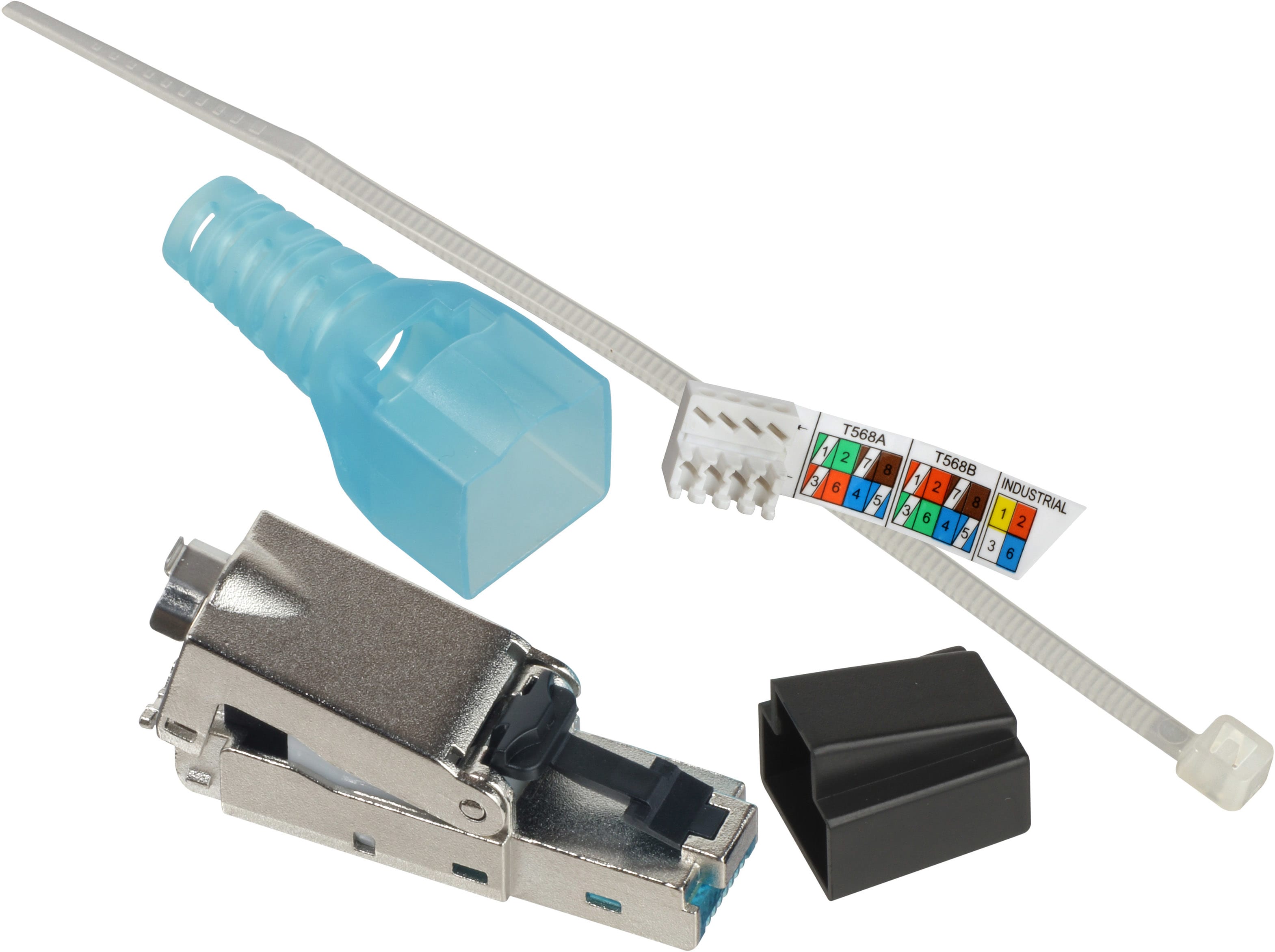 Actassi - prise mâle RJ45 STP Cat6A compatible 4PPoE - H14mmxL45mmxP14mm - métal et plastique - configuration des couleurs de câblage : TIA-568A/B - cable rigide diamètre extérieur AWG22 à AWG26 ( 6…9 mm) - livré avec collier serre cable