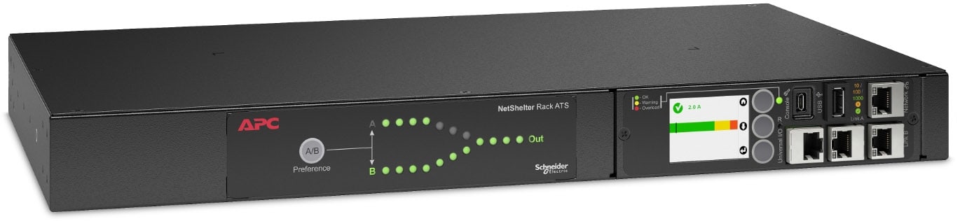 Le commutateur rack ATS NetShelter de transfert automatique est la cinquième génération de commutateurs à haute disponibilité offrant un meilleur contrôle de votre équipement informatique, du cloud à la périphérie. Grâce à sa fiabilité, son agilité et sa facilité de gestion de pointe, il fournit une alimentation redondante aux charges d'équipement à un seul cordon dans le rack informatique. AP4423A est un commutateur de transfert automatique monophasé 1U avec courant nominal 16 A, tension nominale 230 V et capacité de charge 3 700 VA. Il est livré avec 2 entrées IEC C20 et 8 prises IEC C13, 1 prise IEC C19. Il a été mis à niveau avec la carte de gestion réseau APC NMC3 et diverses avancées techniques pour le partage de port réseau, la surveillance de l’environnement et une sécurité renforcée. Il bénéficie d'une garantie standard de 2 ans et d'une extension de garantie de 5 ans pour une tranquillité d'esprit et une utilisation pendant les années à venir. Les utilisateurs peuvent accéder et configurer le Rack ATS via une interface Web sécurisée, SNMP, CLI et sont entièrement compatibles avec EcoStruxure IT.