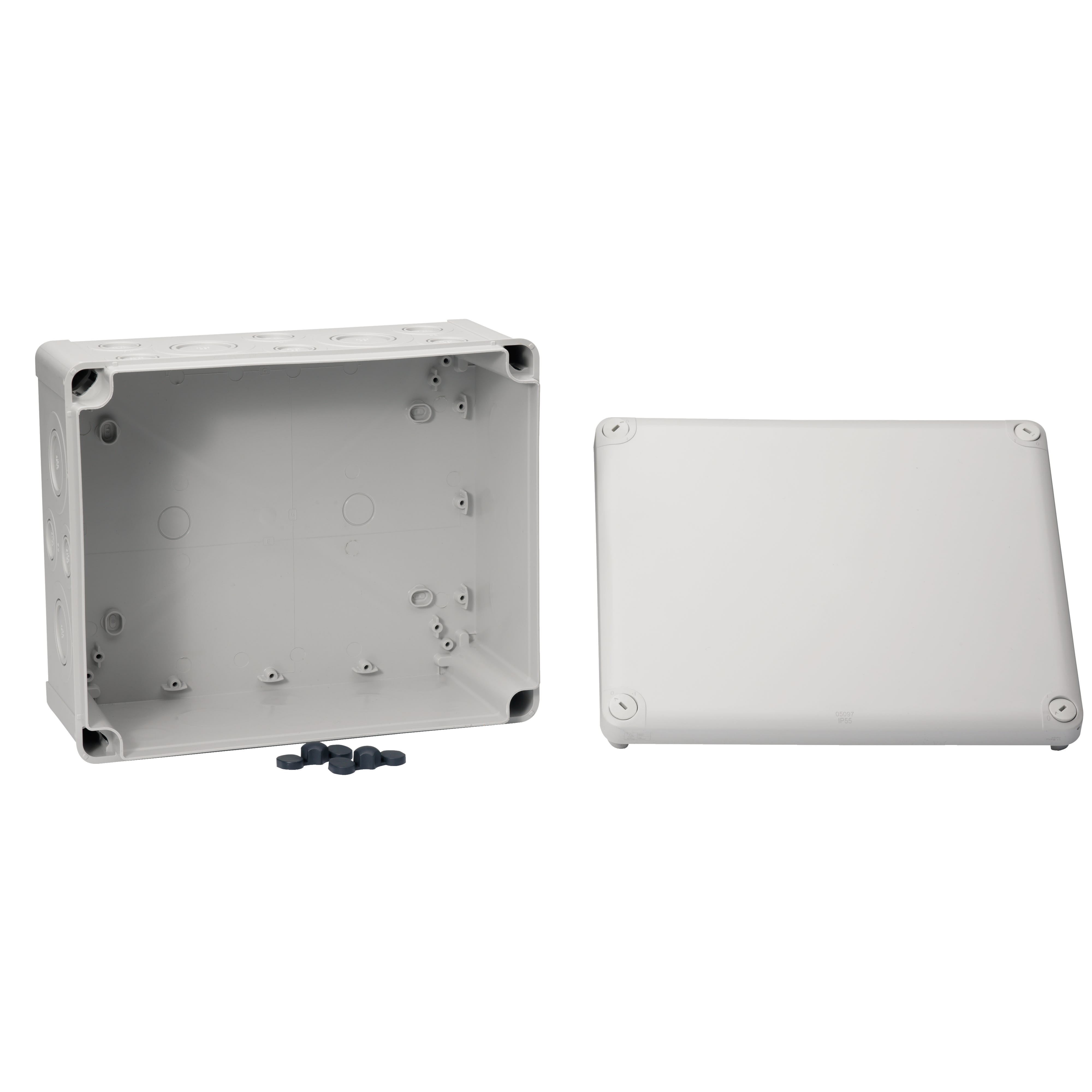 Mureva Box - boîte de dérivation en saillie - 275 x 225 x 120 mm - entrées défonçables 16 M20/25 | 8 M25/32 - vissé couvercle - 1 pièce - gris RAL 7035 - IP55 IK07 - corps & couvercle polypropylène -750°C -CE -classe II -sans halogène