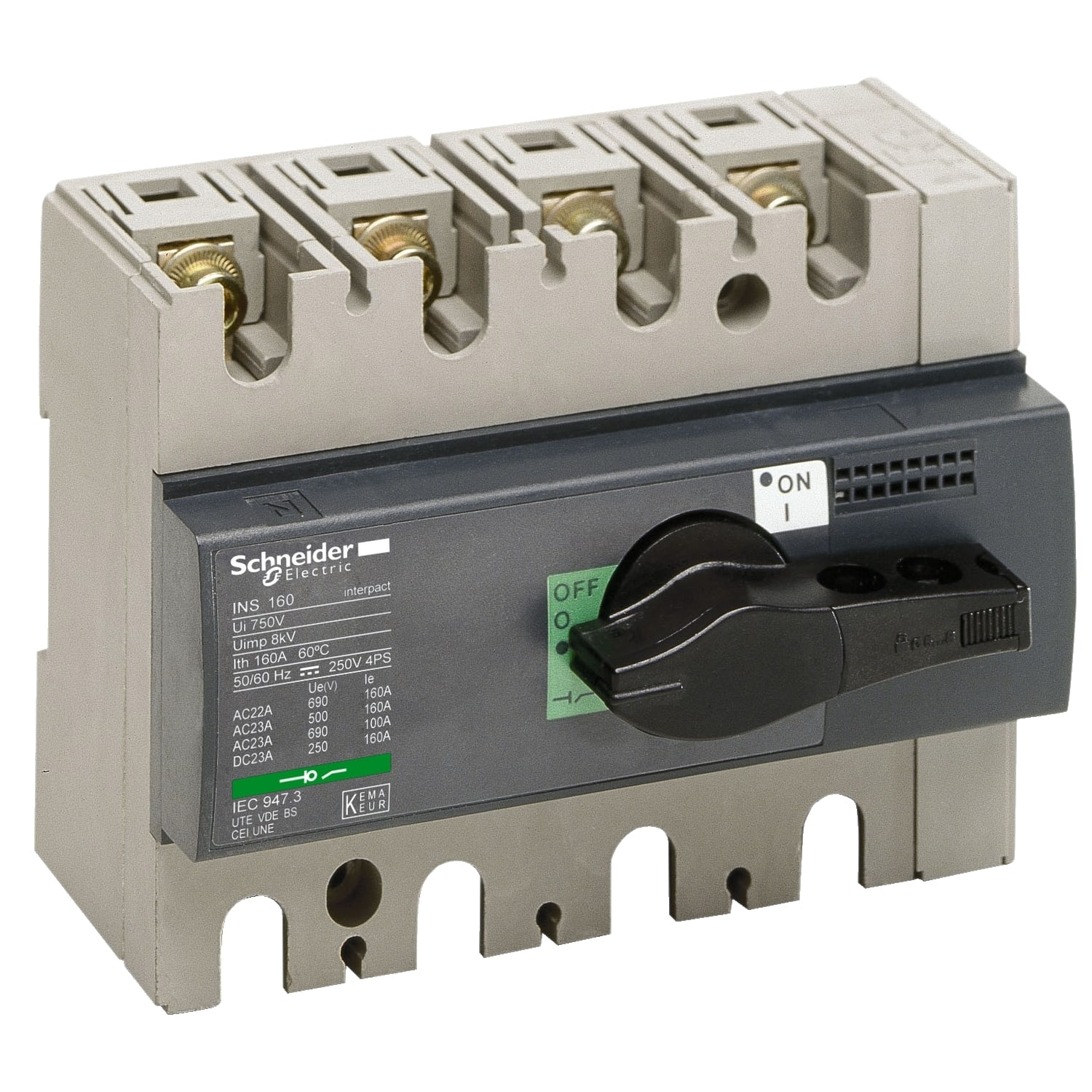 ComPacT INS - interrupteur sectionneur Interpact INS160 3P 160 A - type de réseau : CC, CA - fréquence du réseau 50/60 Hz - tension assignée d'isolement : 750 V CA 50/60 Hz - tension assignée d'emploi : 125 V CC - 690 V CA 50/60 Hz