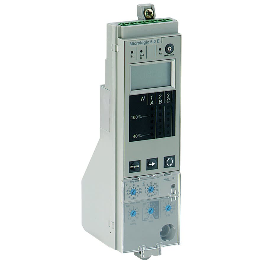 Micrologic 5.0E (compteur d'énergie) est une unité de contrôle électronique destinés aux disjoncteurs débrochables Compact NS630b à NS1600 Cette unité de contrôle dispose d'une protection sélective (LSI) et est conçue pour protéger les circuits de puissance et les charges Il intègre une protection longue durée réglable contre les surcharges Il offre également une protection de courte durée réglable et une protection instantanée contre les courts-circuits Micrologic 5.0E indique les surcharges avec une LED d'alarme Il est capable d'afficher la cause du déclenchement via 3 autres LED Micrologic 5.0E est équipé d'un écran LCD numérique qui affiche l'énergie active avec une précision de 2% Cette unité de contrôle peut être associée à un châssis de base Compact NS débrochable