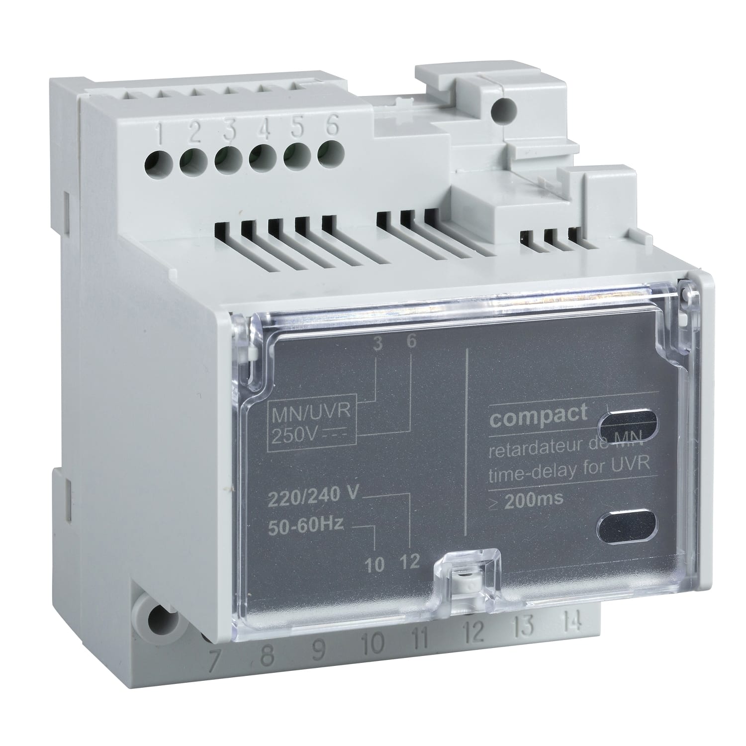 Ce relais temporisé est un auxiliaire pouvant être associé à un déclencheur à minimum de tension (MN). Il doit être associé à un déclencheur à minimum de tension 250VDC MN. Il élimine le risque de déclenchement intempestif dû à des chutes de tension transitoires d'une durée de 200ms à 3s. Son alimentation est de 220/240VAC 50/60Hz. Cette unité de temporisation est fixée à 200ms. Cet accessoire externe peut être monté dans le tableau.