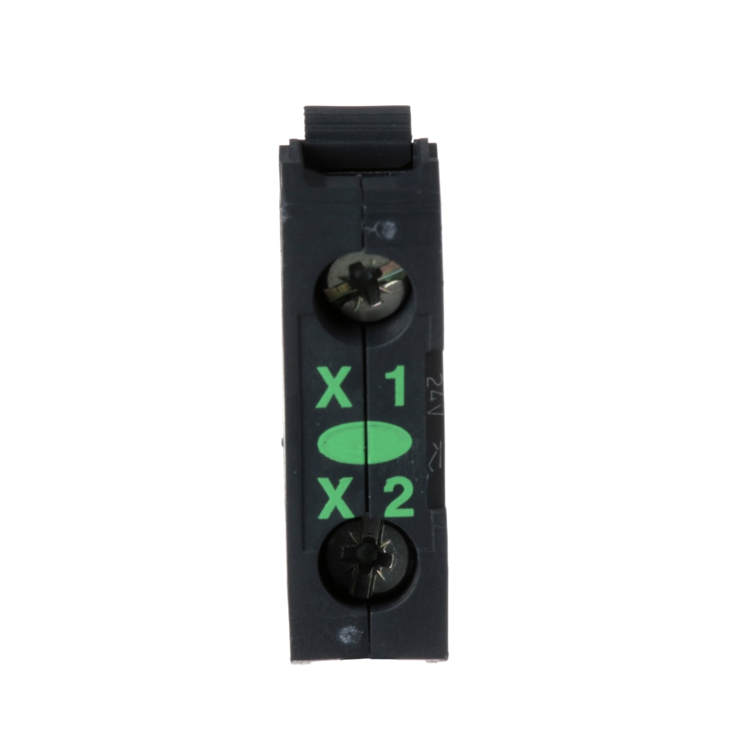 Le produit présenté est un bloc lumineux à DEL intégrée verte conçu pour être alimenté en 24 V CA/CC.