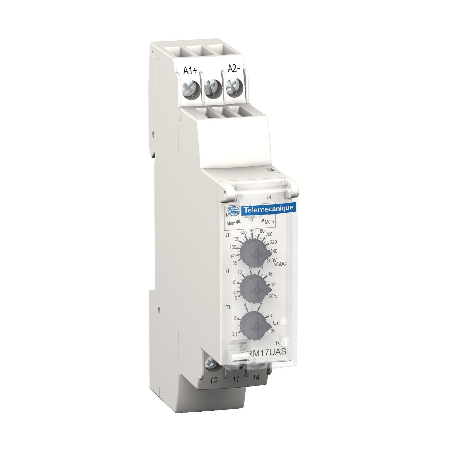 Harmony control - relais de contrôle de la tension - sur ou sous tension 65..260 V AC DC - RM17UAS - largeur : 17,5mm - IP20 (bornes), IP30 (gaine) - 1250 VA - temporisation : réglable 0,1…10 s, +/-10 % lors du dépassement du seuil
