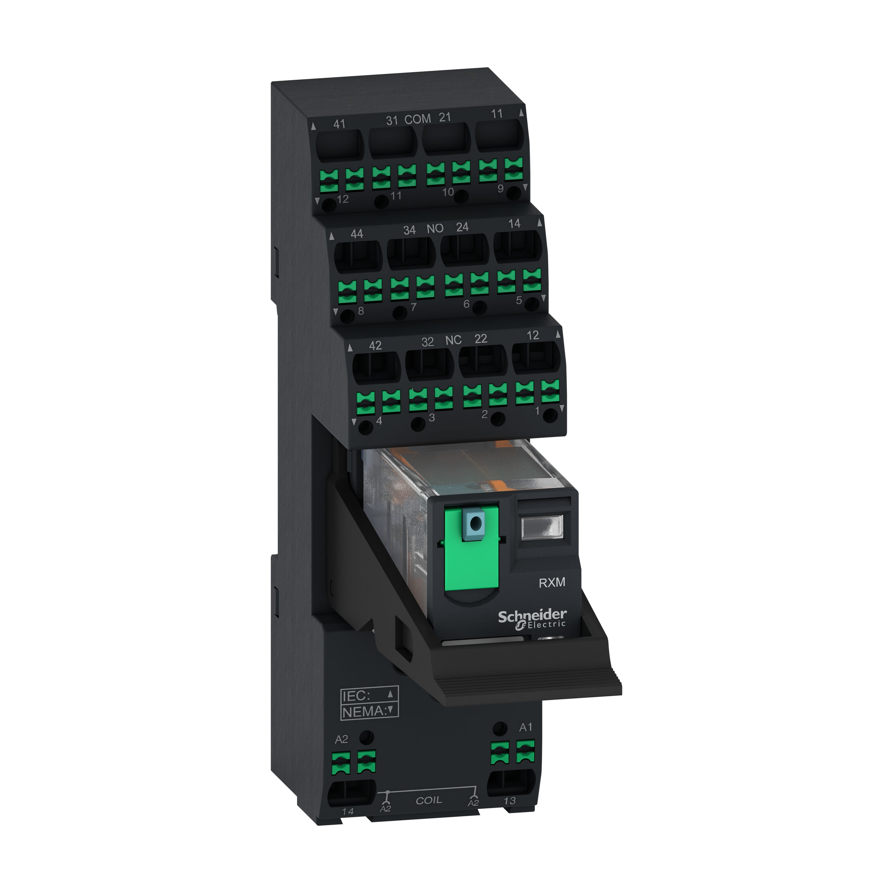 Ce relais miniature enfichable appartient à la gamme de relais électromécaniques Harmony de Schneider Electric. Il s'agit d'un relais préassemblé monté sur une embase à bornes push-in à contacts séparés avec collier de serrage intégré. Il s'agit d'un relais mécanique miniature de 12A, 24Vdc, 2 inverseurs. Ce relais prémonté est un ensemble prêt à l’emploi qui permet de gagner du temps lors de l'installation. Il offre également un bouton de test verrouillable en une manœuvre et un voyant LED. Le raccordement de l'embase du relais miniature se fait par un bornier de type "push-in". Ce relais préassemblé pèse 117 grammes. Sa conception convient aux machines industrielles, à l’emballage, au textile, au CVC, aux armoires de commande d’automatisation, aux tableaux de distribution basse/moyenne tension, aux contrôles de moteur, aux interfaces de PLC, aux alimentations, aux équipements du bâtiment ou médicaux, aux contrôles d’éclairage. Ce produit est conforme aux normes et certifications internationales telles que IEC, UL, EAC, CSA, Lloyd's, RoHS et REACH. Il est vendu par lot de 1. Les relais enfichables RXM sont une série de relais industriels enfichables conçus pour les systèmes d’automatisation simples et complexes et disponibles avec 2 contacts NO (12A), 3 contacts NO (10A) ou 4 contacts NO (6A).