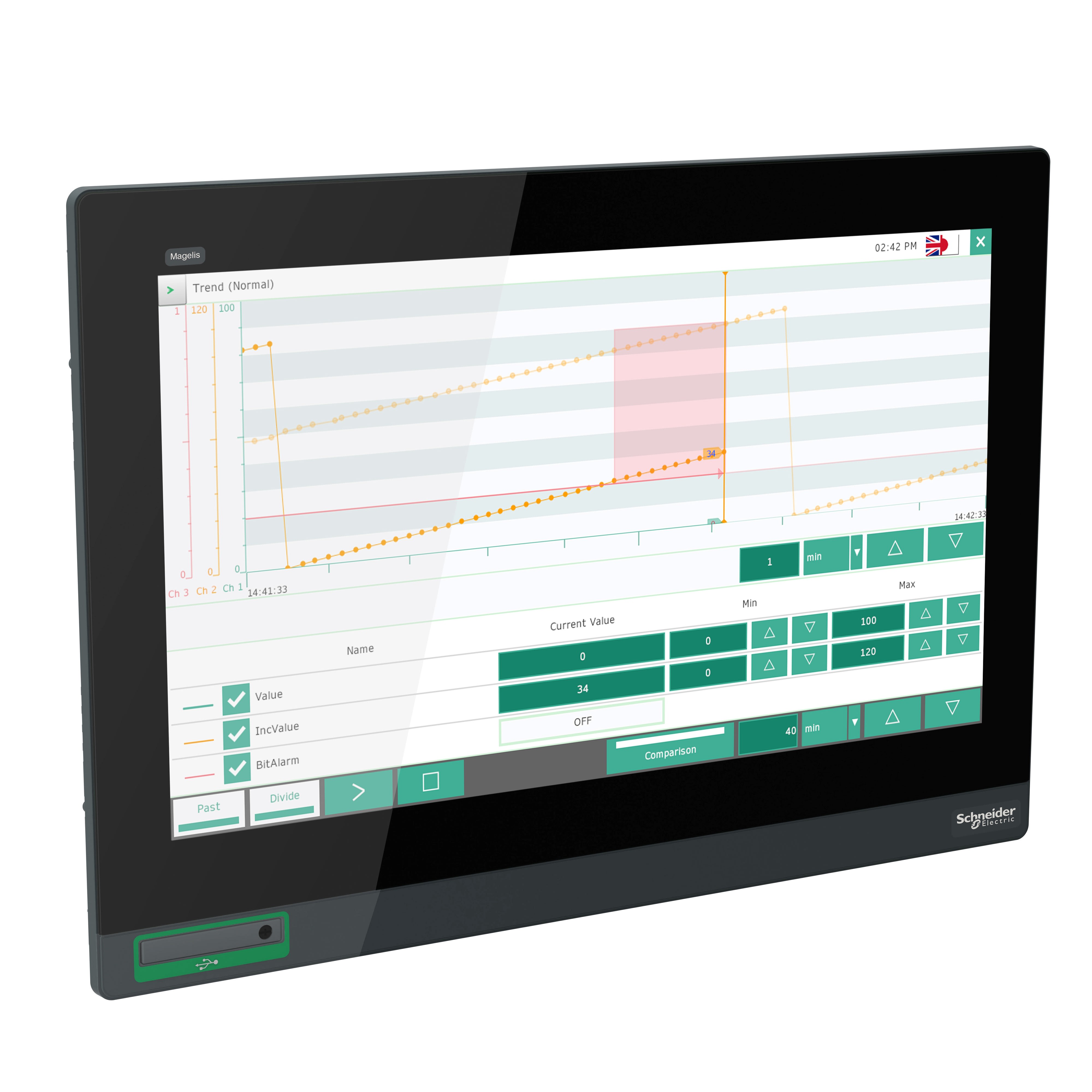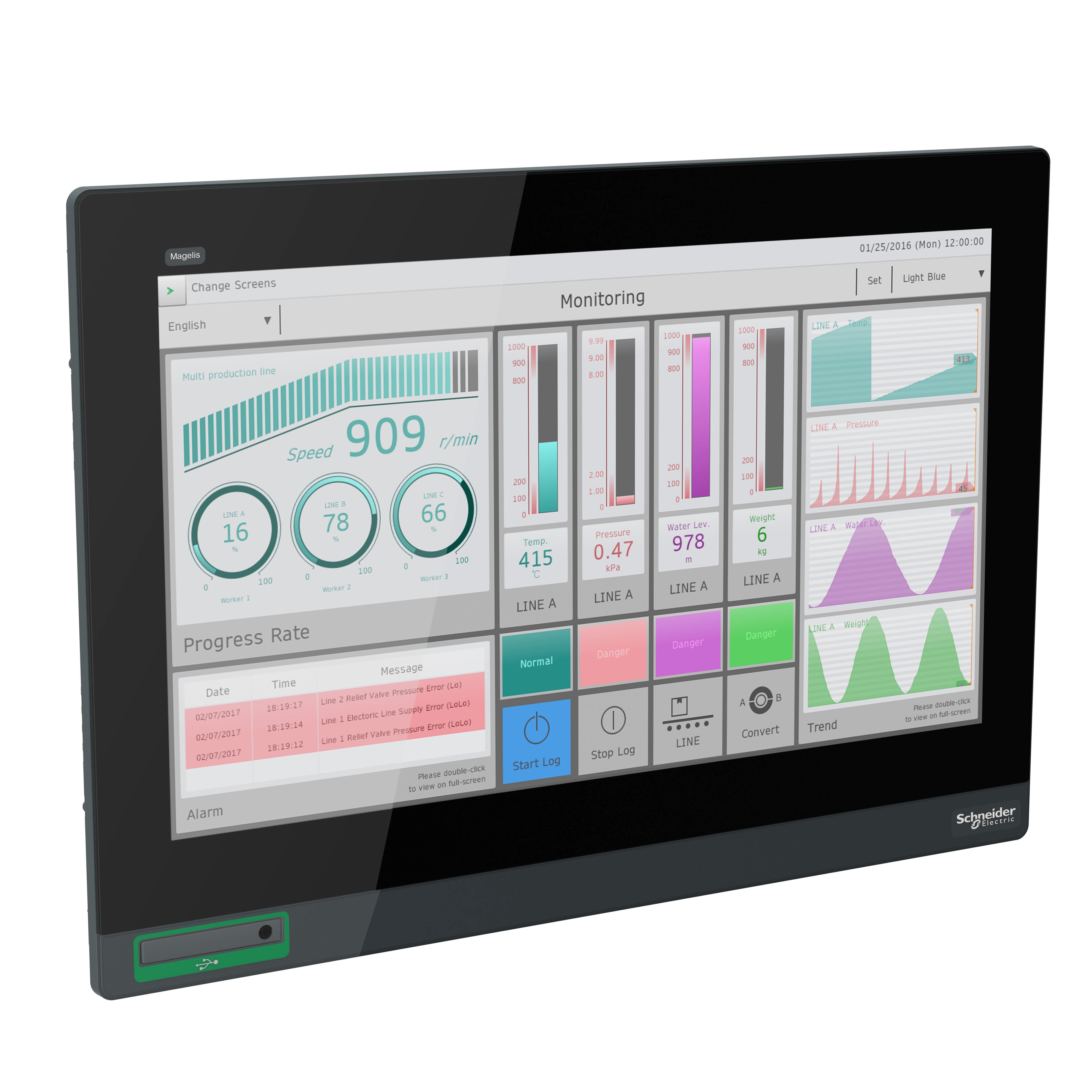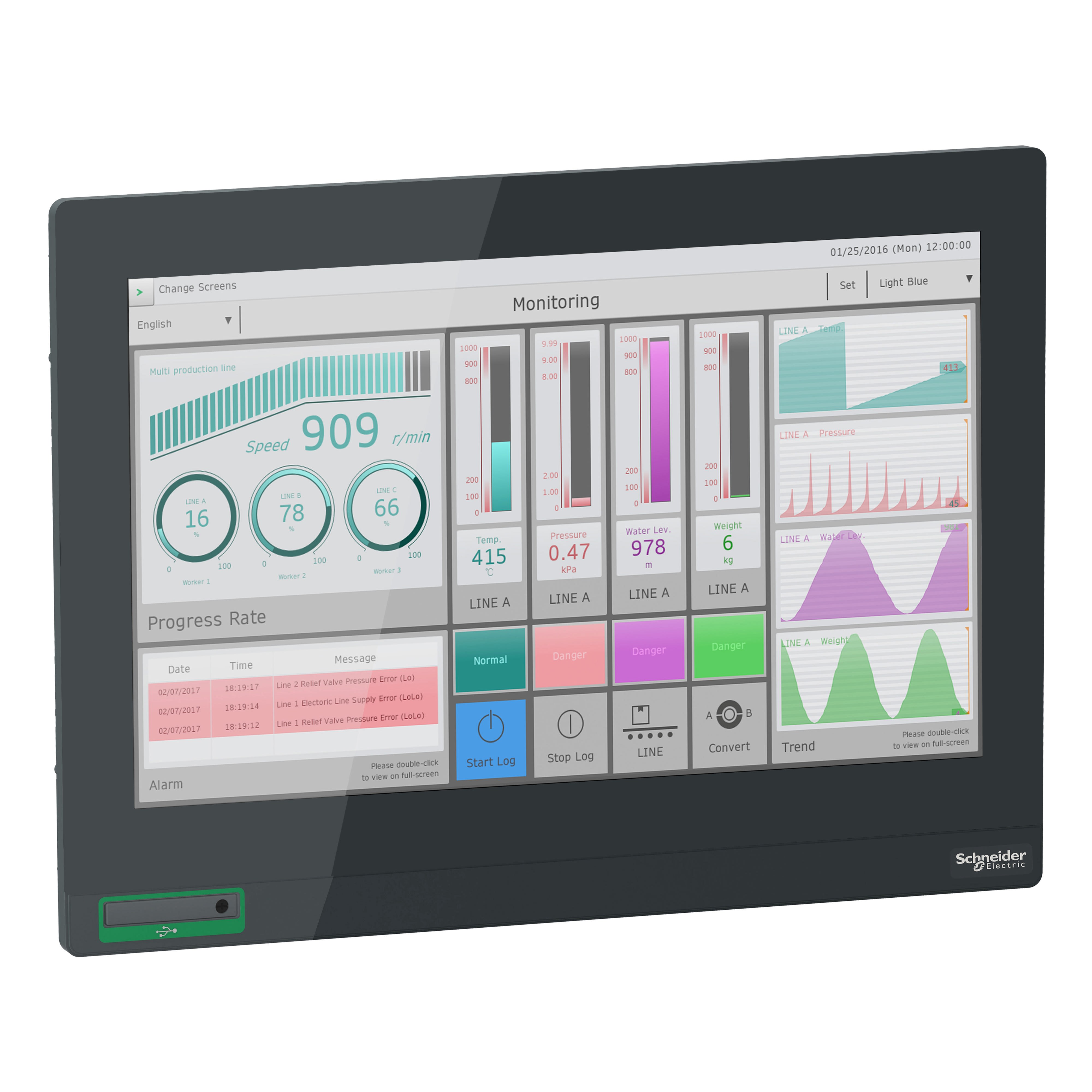 Cet écran tactile de la gamme Harmony GTU dispose d'un écran LCD TFT couleur de 18,5 pouces, prend en charge la résolution FWXGA de 1 366 x 768 pixels. Il est équipé de connexions intégrées USB 2.0 type A, USB 2.0 type mini B. L'écran tactile est conçu avec la technologie capacitive projetée multi-points de contacts (PCT) 50 millions de cycles. Cet écran tactile est doté de 16 millions de couleurs et d'une durée de vie de 50 000 heures. Il s’agit d’un produit classé IP66/IP67 et NEMA 4X. Ses dimensions sont 483 x 69 x 337 mm (largeur x profondeur x hauteur)et pèse 6,8 kg. Il est adapté aux machines complexes, aux aliments/boissons, à l'eau, aux eaux usées, aux mines, aux minéraux, à l'emballage métallique et aux applications de convoyage. Ce produit est certifié RCM, CULus, CE et KC. Il est conforme aux normes UL 508, ANSI/ISA 12-12-01, classe I division 2, CSA C22.2 No 213, CSA C22.2 No 142 et IEC 61132-2. Cet écran est compatible avec toutes les unités GTU Premium et Open Harmony. Il prend en charge le montage sur panneau pour une installation intérieure. Les produits Harmony GTU (anciennement Magelis GTU) sont des panneaux universels qui incluent une interface de type smartphone et une technologie sans fil.