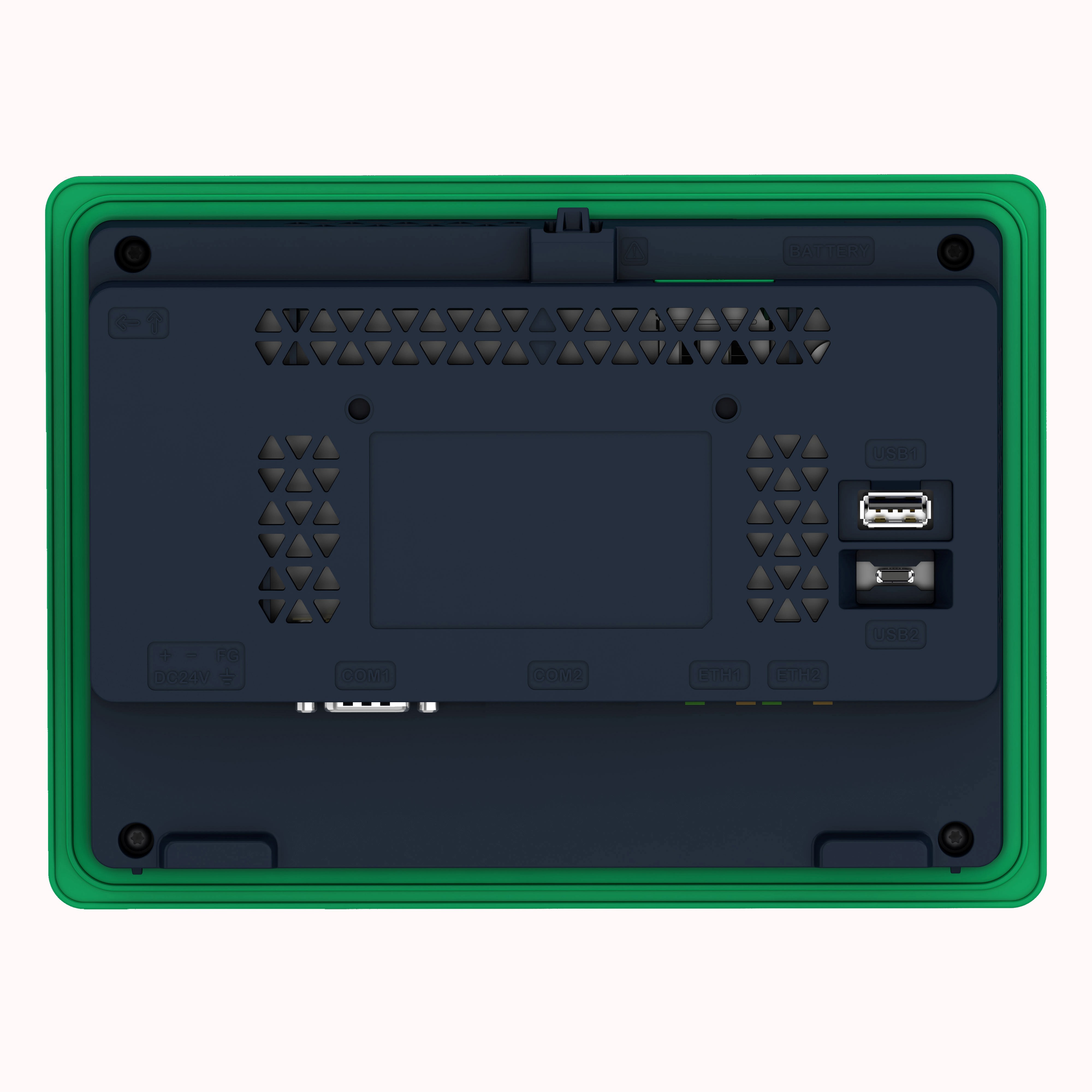 Cet écran tactile IHM fait partie de la gamme Harmony ST6. Cette IHM tactile résistive unique est constituée d'une face avant en aluminium avec un indicateur d'état multicolore indiquant les différents modes de fonctionnement. Cette interface IHM est large de 7 pouces avec 16 millions de couleurs et une résolution de 800 x 480 pixels (WVGA). Il est alimenté par le logiciel EcoStruxure Operator Terminal Expert pour une expérience utilisateur intuitive. Il dispose d'un processeur ARM Cortex-A8 800 MHz, d'une mémoire périphérique de 1 Go, d'une mémoire de données utilisateur de 128 Mo et d'une mémoire de sauvegarde de 512 Ko. Cet IHM ST6 prend en charge 2 ports Ethernet, COM1 (RS-232C), COM2 (RS-485), 1 port USB 2.0 Type A et 1 port USB 2.0 Micro-B. Ses dimensions sont 208 x 153 x 45 mm (largeur x hauteur x profondeur) et pèse 0.80Kg. Il est destiné aux industries telles que l'emballage, l'agroalimentaire, le textile, les équipements HVAC et les compresseurs, ainsi qu'aux utilisateurs finaux qui recherchent la maintenance de leurs appareils Web. Il est conforme aux normes EN (61000-6-4, 61000-6-2, 61131-2), UL 61010-2-201, CSA C22.2 No 61010-2-201 et aux certifications CSA, CE, China RoHS, KC, REACH. Cette gamme est conçue pour répondre aux besoins des opérateurs de machines simples pour une bonne visualisation, une bonne connectivité, une cybersécurité avec EcoStruxure Secure Connect Advisor et des équipements rentables. Les différents degrés de protection sont IP65F, Type 1, Type 4X (usage intérieur seulement), Type 13 (sur le panneau avant lorsqu'il est correctement installé dans un boîtier).