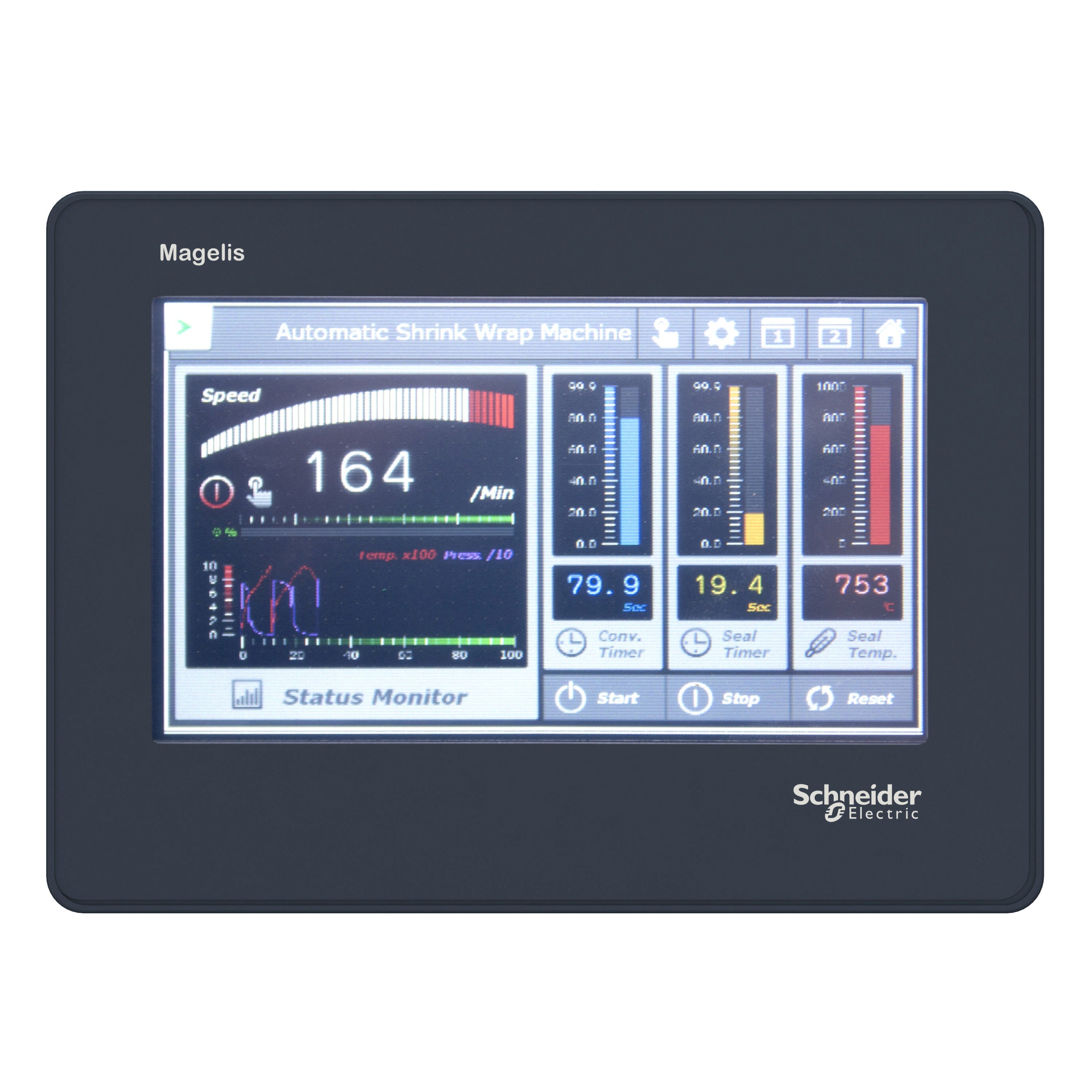 Cet écran tactile IHM de la gamme Harmony STO et STU, est fournie en 12 V à 24 V CC, dispose d’un écran LCD TFT couleur de 4,3 pouces avec 480 x 272 pixels et 26 Mo d’EPROM. Il dispose également de 1 hôte + 1 port USB mini-B et 1 port RS232C. Il est idéal pour optimiser les informations et la communication avec les systèmes d'automatisation de l'industrie et les infrastructures telles que les machines compactes, les systèmes de manutention, les machines agroalimentaires et l'industrie pharmaceutique. L’écran affiche des pages graphiques en couleur. Son port hôte RS485 est idéal pour superviser et contrôler des systèmes et des machines simples (à supprimer).
