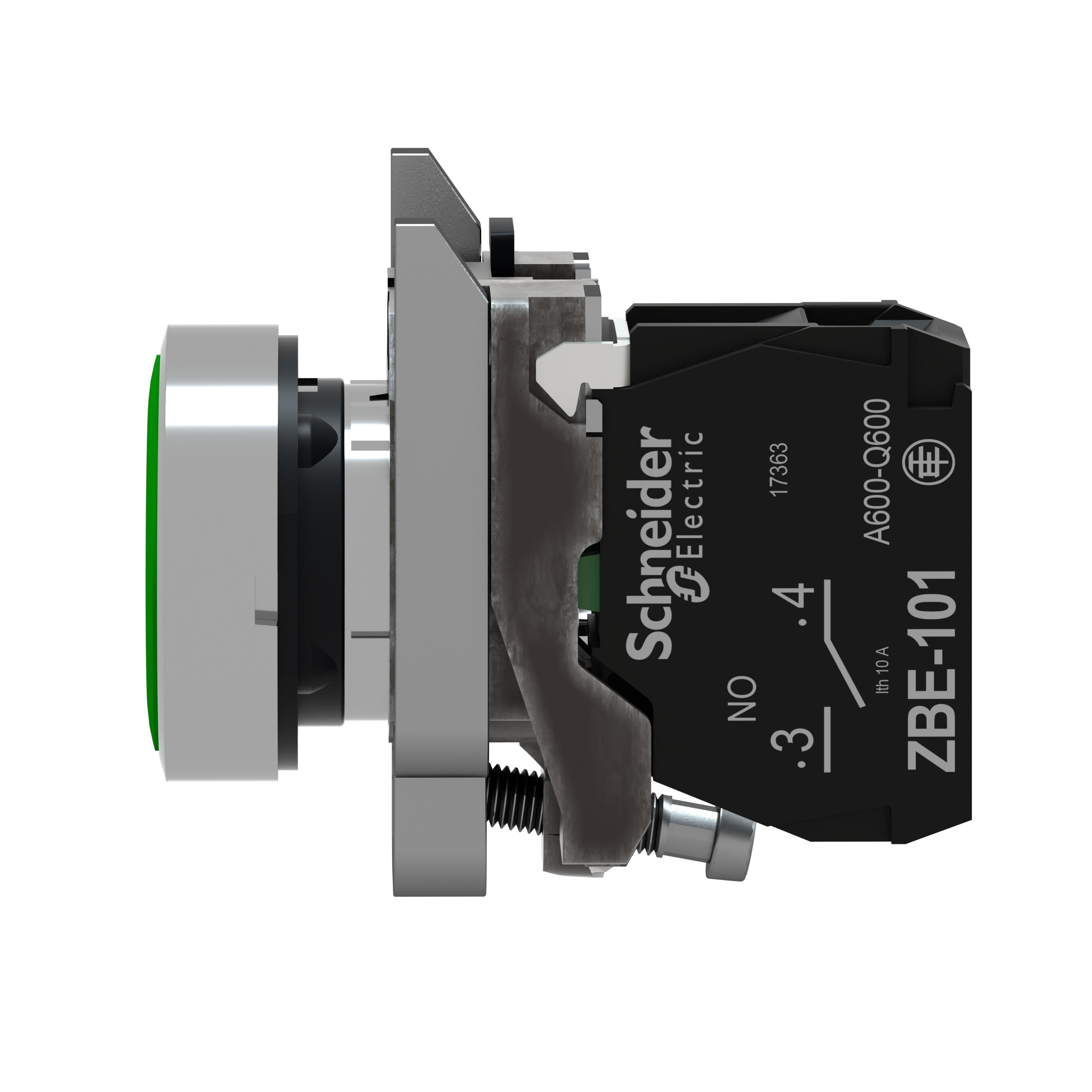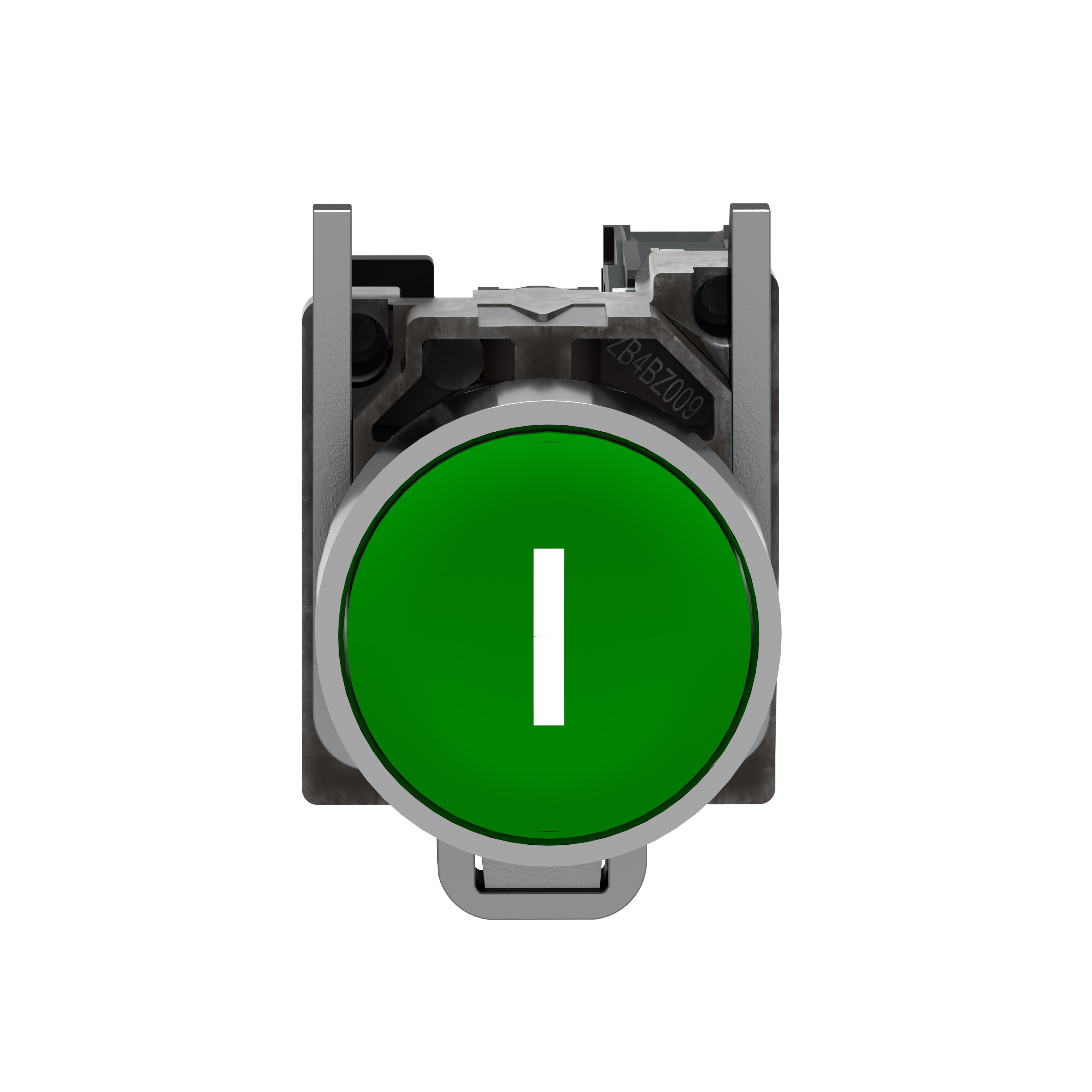 Harmony XB4 - bouton poussoir - à impulsion - poussoir affleurant - vert - avec marquage - Ø22 - collerette dépassante - métal chromé - 1F - fixation Ø22 - raccordement par vis-étrier
