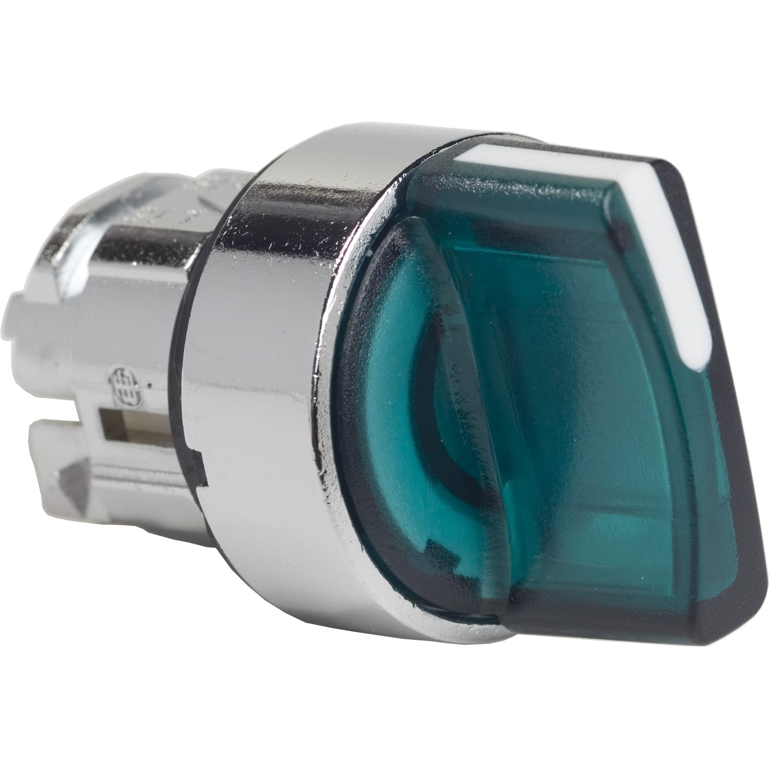 Harmony XB4 - tête de bouton tournant - à manette - lumineux - DEL intégrée - vert - Ø22 - collerette dépassante - métal chromé - 3 positions - à rappel de gauche au centre - fixation Ø22