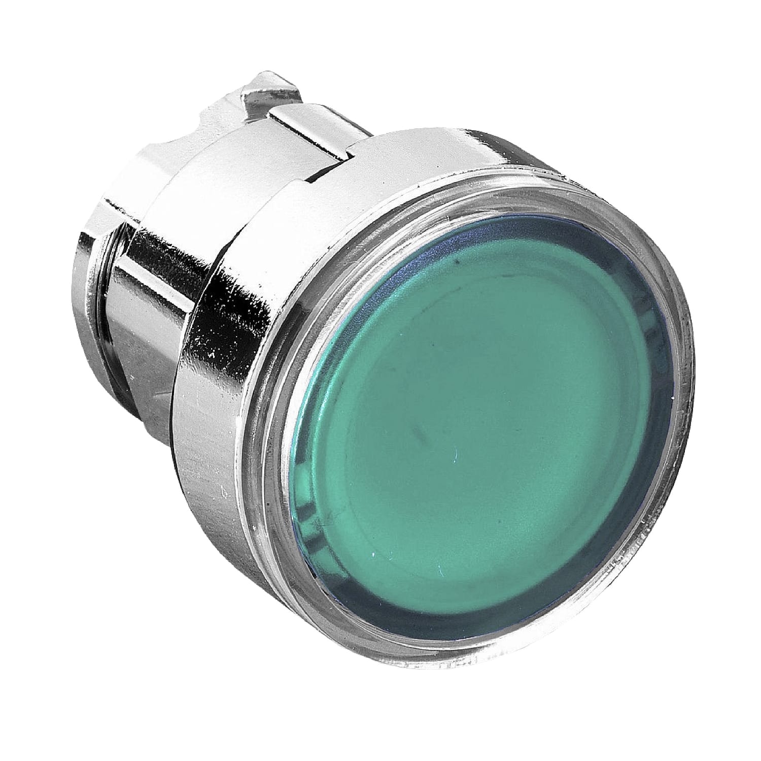 Harmony XB4 - tête de bouton poussoir - à impulsion - lumineux - pour DEL intégrée - poussoir affleurant strié - vert - Ø22 - collerette dépassante - métal chromé - fixation Ø22